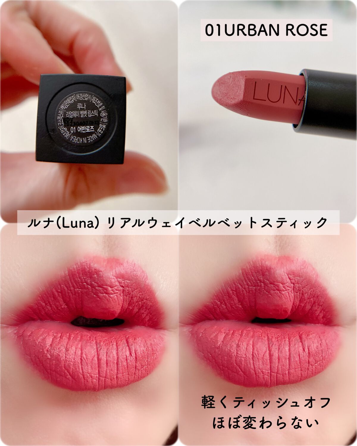 LUNAのリップは、トーンダウンされたベルベットテクスチャーで 軽く柔らかくフィット。 どちらも日常使いしやすく、PC問わず使いやすそうな カラーだよ。マットタイプだけどぱさつかず、そのまま 発色が長時間続く感じ👍