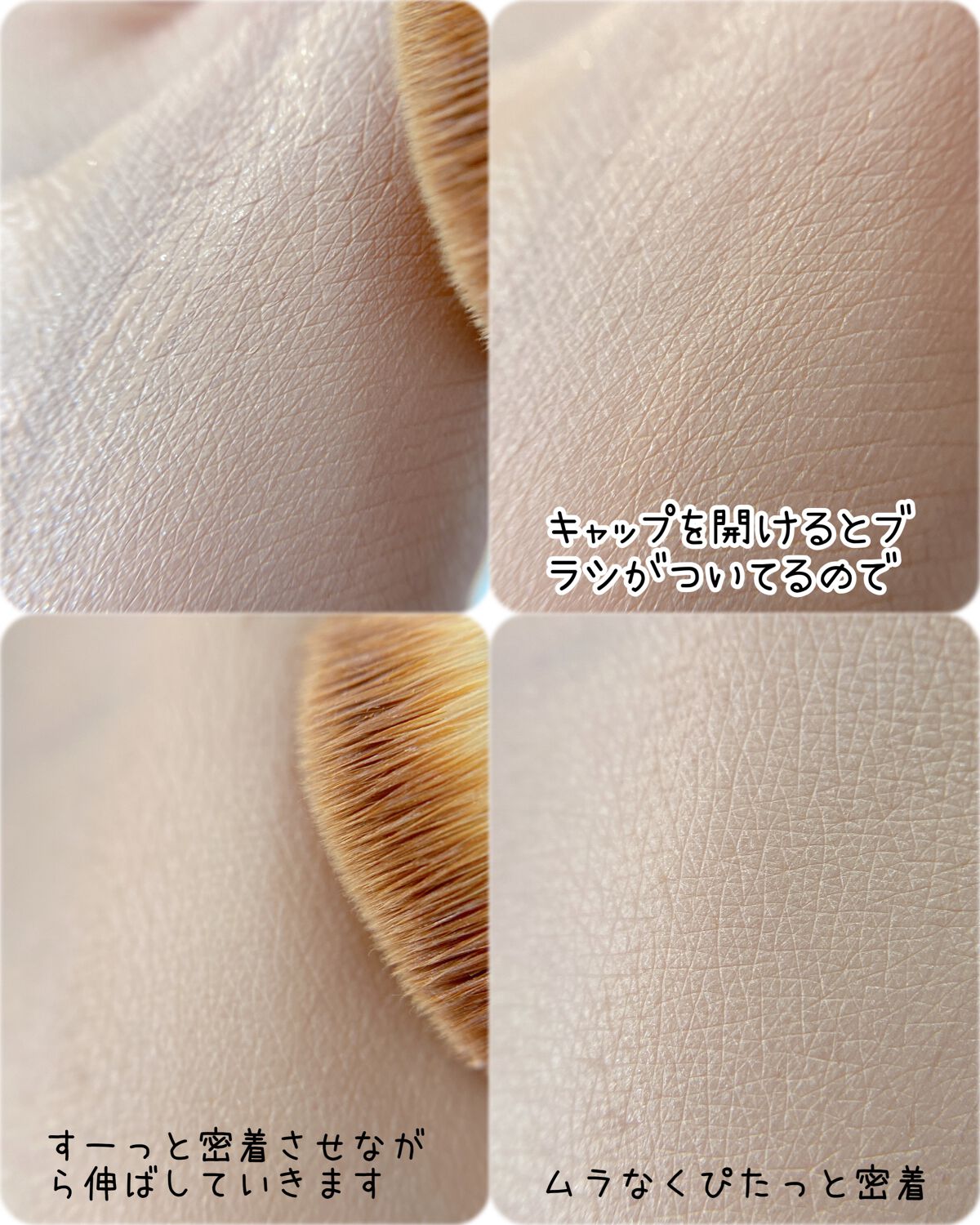 これねファンデーションブラシが一体型で毛穴に入り込みむらなく綺麗に仕上がるの 肌あたりもマイルドで、ブラシを使う事でピタッとお肌に密着してくれ、気になる毛穴にも均等にフィットし、滑らかなおはだに仕上げてくれる感じ 厚塗り感はなく、ツヤも残してくれるんだけど、カバー力もしっかりあって仕上がりもべとつかない目元もヨレにくい感じしたよ
