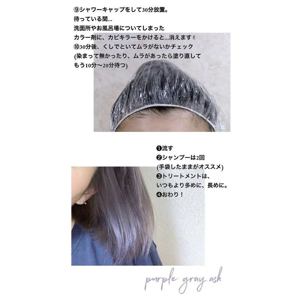 必見!★インスタの保存数に驚き!★すごく評判だった内容です!😳🌸🏡おうちで出来る!『お洒落カラーHOWTO』*ブリーチ髪で、困っている方*根元から黒髪が出てきている方*黒染めはしたくないけど、 トーンダウンしたい方*自分でするとムラが心配な方*市販のカラー剤では満足できない方*派手髪が好きな方*お洒落が好きな方…なんでもOKです!✲セルフカラーを普段からしていた私が上手くできる方法を、初めてご紹介✏︎〜(美容師資格は無いので、あくまでも自己満レベルで楽しんで下さい).。.:*・゚+.。.:*・゚+.。.:*・゚+.。.:*・゚+.。.:*・゚🥀今回は、ブルベ冬に似合う『パープルグレーアッシュ』にしました❄︎仕上がりは、ロシアンブルーみたいな感じ🐈にゃん画像に追記いる所だけ紹介/⬇︎⬇︎⬇︎⬇︎スタート⬇︎⬇︎⬇︎⬇︎✔️髪のベースを把握。(人それぞれ違う)✔️用意するもの・エンシェールズカラーバター「プラチナシルバー」&「アッシュパープル」・白いトリートメント(リンス)なんでもOK・サランラップ・ゴム手袋■あるとよりいいアイテム(全部100均で入手)・イヤーキャップ・ケープ(美容院で身体に巻いてくれるやつ)・くし(きめ細かいやつ)・シャワーキャップ✔️HowtoSTART▶️🌷カラー剤を作る(手袋してね!!)🌷塗っていくよ①〜⑤(画像)⑥塗れた!と思っても意外と塗れてません。笑5センチ幅くらいの髪を順番に取って薄く伸ばして、再度表から、裏から、ムラが無いように塗り塗り。⑦塗ったやつから上に、ていっって乗せていったら楽です✌︎ベースを思い出して…黒髪や、赤みが強い所には、シルバー系は上手く色が入りません。そこで、紫で赤みや黄味を抑えていきます。⑧下の方まで塗ったらただの紫ヘアになってしまうから、根元や、上の方だけにアッシュパープルの原液!!を塗っていきます。イメージ:気になる所をコンシーラーで隠す感じ(笑)⑨シャワーキャップ(又はサランラップ巻いても良い)をして、30分放置。〜(画像)🌷流します🕊終わりです〜!黒髪が出てきている所も誤魔化せるし、トーンダウンも、透明感も、お洒落さも、全部手に入ります☺️❤︎❤︎カラーバターは色持ちも長いので、長い間お気に入りのカラーを楽しめます✌︎(ムラシャンすると尚良し)想像より簡単におうちでカラーできるので、皆さんも挑戦してみて下さい💐もう少し皆んなで、自粛頑張りましょう🌱🍰Instagram:mino02ri#エンシェールズ#ANCELSCOLORBUTTER#プラチナシルバー#アッシュパープル#ヘアカラー#セルフヘアカラー#マニパニ#韓国メイク#韓国ヘア#twice#韓国コスメ#韓国女子 #パープルヘア#ブリーチ #ボブ_ヘアアレンジ#私の上半期ベスコス2021#これがないと完成しません