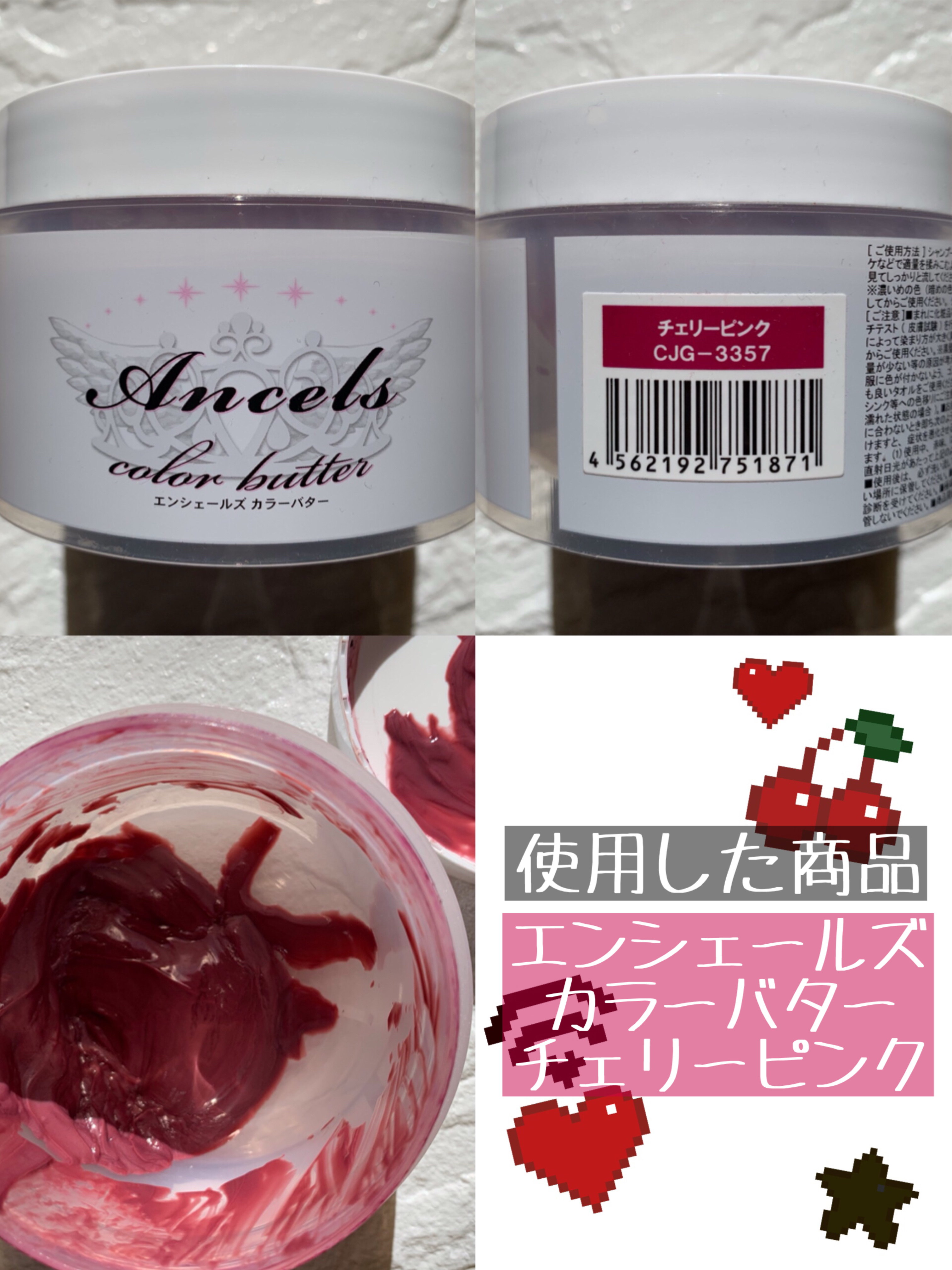 ANCELSCOLORBUTTER チェリーピンク今回はプチサイズ30gを購入者しました。一袋300円ぐらいだった気がします。胸らへんまでのロングだと全頭染めるには5袋必要でした。(大きいサイズ買えばよかった…)髪自体は1度ブリーチ&カラーを...