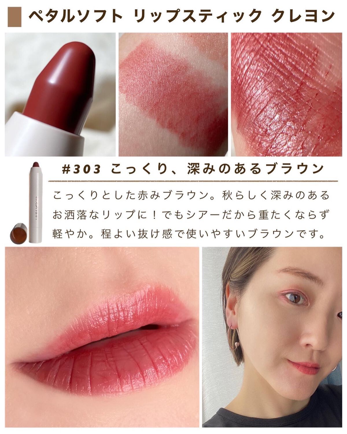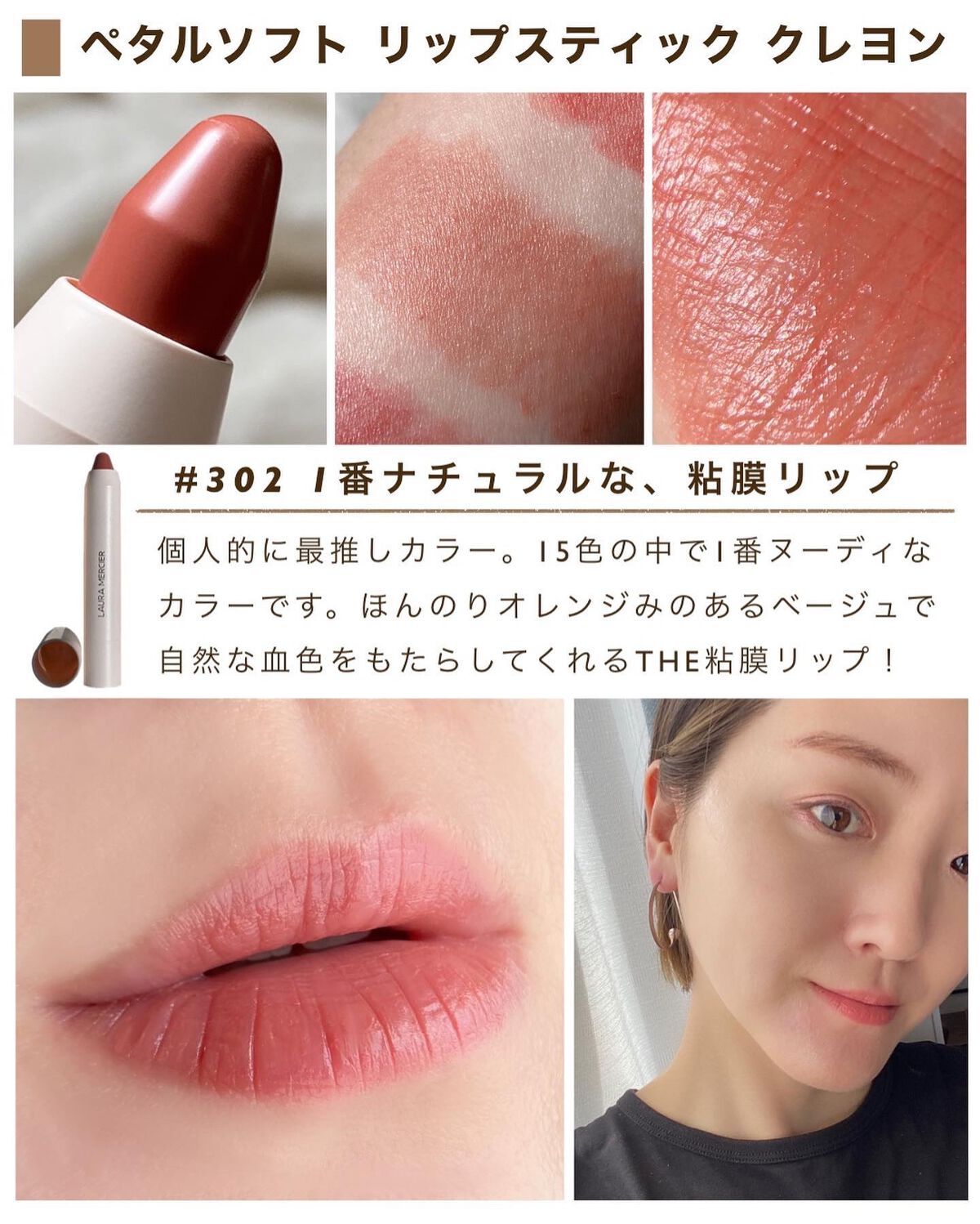 まず、するする塗れる滑らかなテクスチャーですんごく軽い。 でも仕上がりはシアーソフトマット。なんだけど、ちゅるちゅるって感じではなくてほわっとパウダリーさもある。 マット系のリップは粉っぽさが強くて唇の水分持ってかれやすいけど、これはほんとリップバームに近い使用感で平気だった。 唇乾燥しやすい民にはありがたいやつ。そしてしっとりするけど、ペタペタした感じではないから落ちにくいのもうれしい。 ちなみにわたしの最推しカラーは302、15色の中で一番ヌーディなベージュ系のリップ。これぞ粘膜リップって感じの自然な血色感が可愛いのです。 ローラメルシエのブランドの推しカラーは303、PRさんの推しカラーは301だそうです。 あとここにスウォッチはないけど、382の深みレッドは秋冬にぴったりで人気出そうだなあと思ったし、362のコーラルオレンジ系のカラーも可愛い&好きな雰囲気のカラーで非常に悩ましかった。 とにもかくにも使ってみたらあまりによくて感動してしまったこのクレヨンリップ。