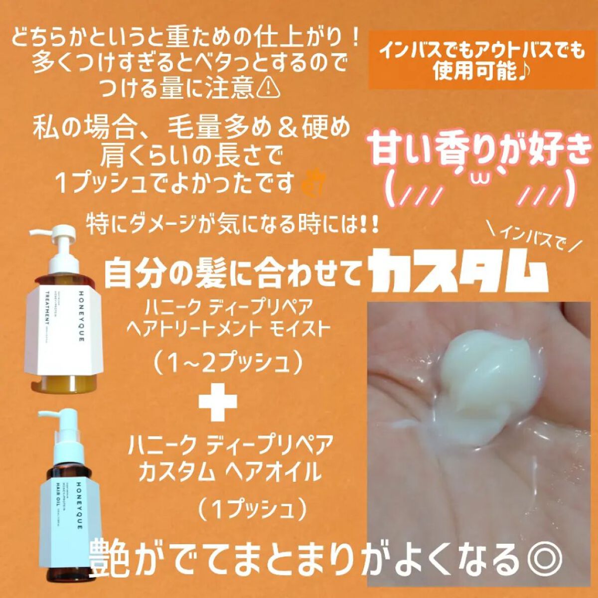 \2WAYヘアオイル/HONEYQUE(ハニーク) ディープリペアカスタムヘアオイルエクストラモイスト 100mL1650円(税込)ガチモニターに参加してます!ヘアトリートメントに混ぜて使うこともできるカスタム2WAYヘアオイル♡!~アウトバストリートメントとして~濡れた髪、乾いた髪にどちらでも使用可○やや重ための仕上がりなので付けすぎるとベタっとするので注意が必要ですが私の場合(毛量多め、硬め、肩くらいの長さ)1プッシュでいい感じに艶も出てまとまりがよくなりました♪香りはシャンプー&トリートメントと一緒の【アクアブロッサムハニーの香り】この匂い本当に好きです💕~インバストリートメントとして~ダメージが気になる時は集中ケアとしてハニークディープリペアヘアトリートメントモイストを1~2プッシュに対してヘアオイルを1プッシュ混ぜてから使うと指通りがよくなっておすすめです👌#ガチモニター_ハニーク#ハニーク#ディープリペアカスタムヘアオイルエクストラモイスト#アウトバストリートメント#インバストリートメント#蜜髪