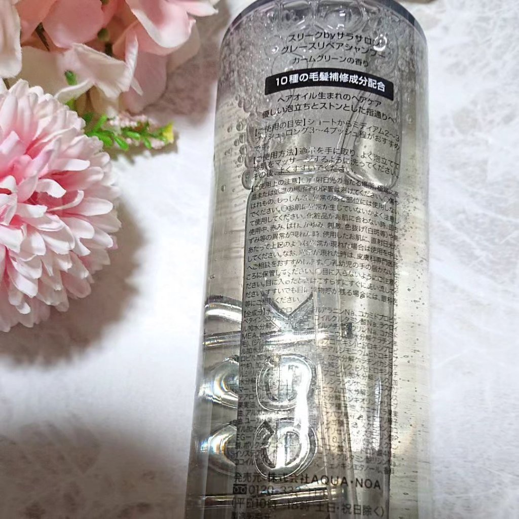 スリーク by サラサロン グレースリペアシャンプー 10種類のダメージ補修成分配合 黒真珠の希少なたんぱく質(コンキオリン)が毛髪表面に吸着しキューティクルを補修 ツヤをあたえてなめらかな指通りに導く 泡立ちが良く洗い流す際もきしまない。 ドライヤー後はサラサラになって良かった😊👌 爽やかなカームグリーンの香りが好き⸜❤︎⸝ スタイリッシュでオシャレなパッケージもお気に入りです( '-'🫶🏻) 髪の調子が良くなるので ついついこればっかり使ってしまう😂
