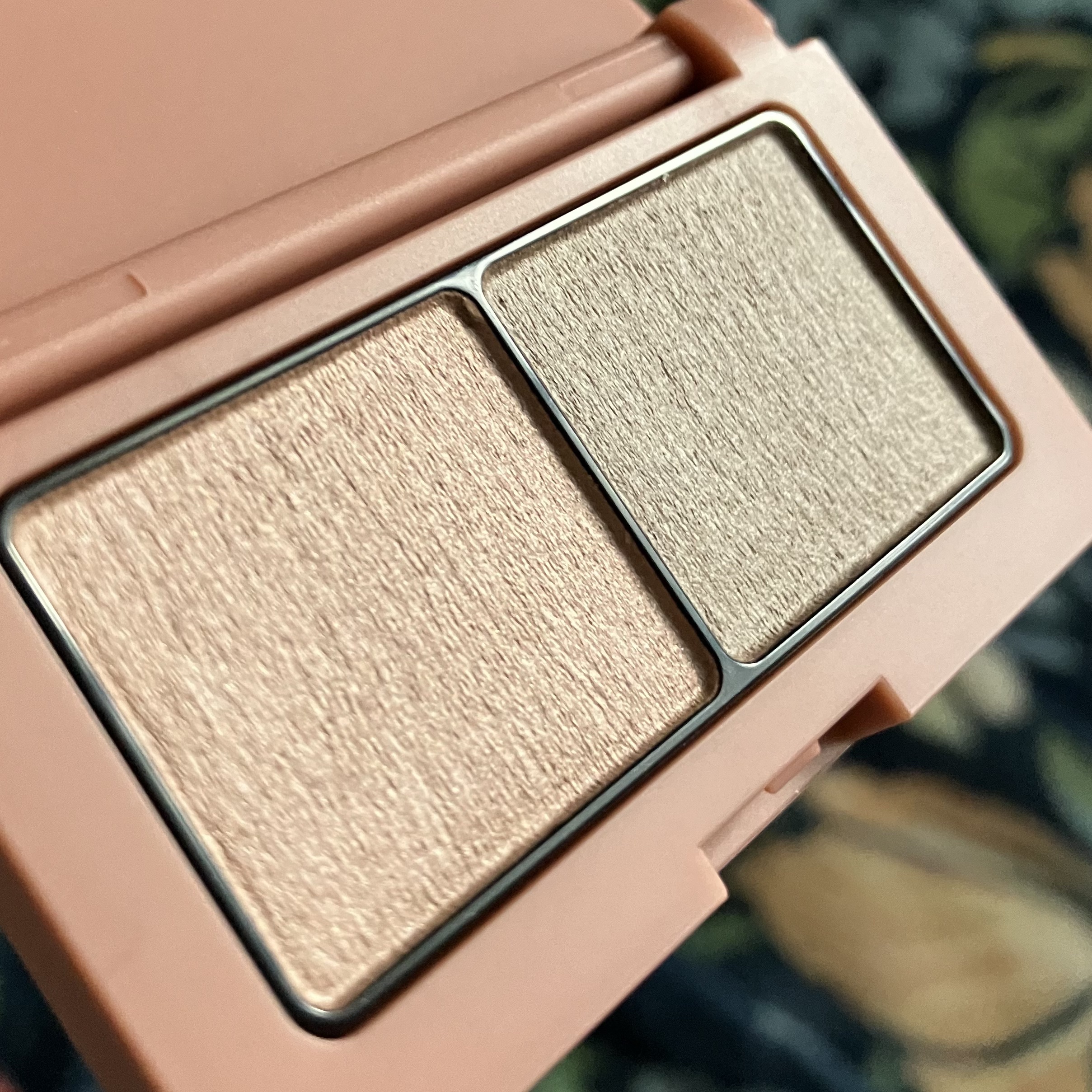 2色なんだけど絶妙に刺さるカラーで見てるだけで癒される(笑) コンパクトだから持ち運びにも良いんだけどツールの付属がないので指塗りか手持ちのブラシか、、、 どちらも結構発色が良いので気をつけないといけない😂 ブラシだとちょっと粉飛びするので指塗りかチップを使うのがベターなのかも。 パケがシンプルで好みです🥰