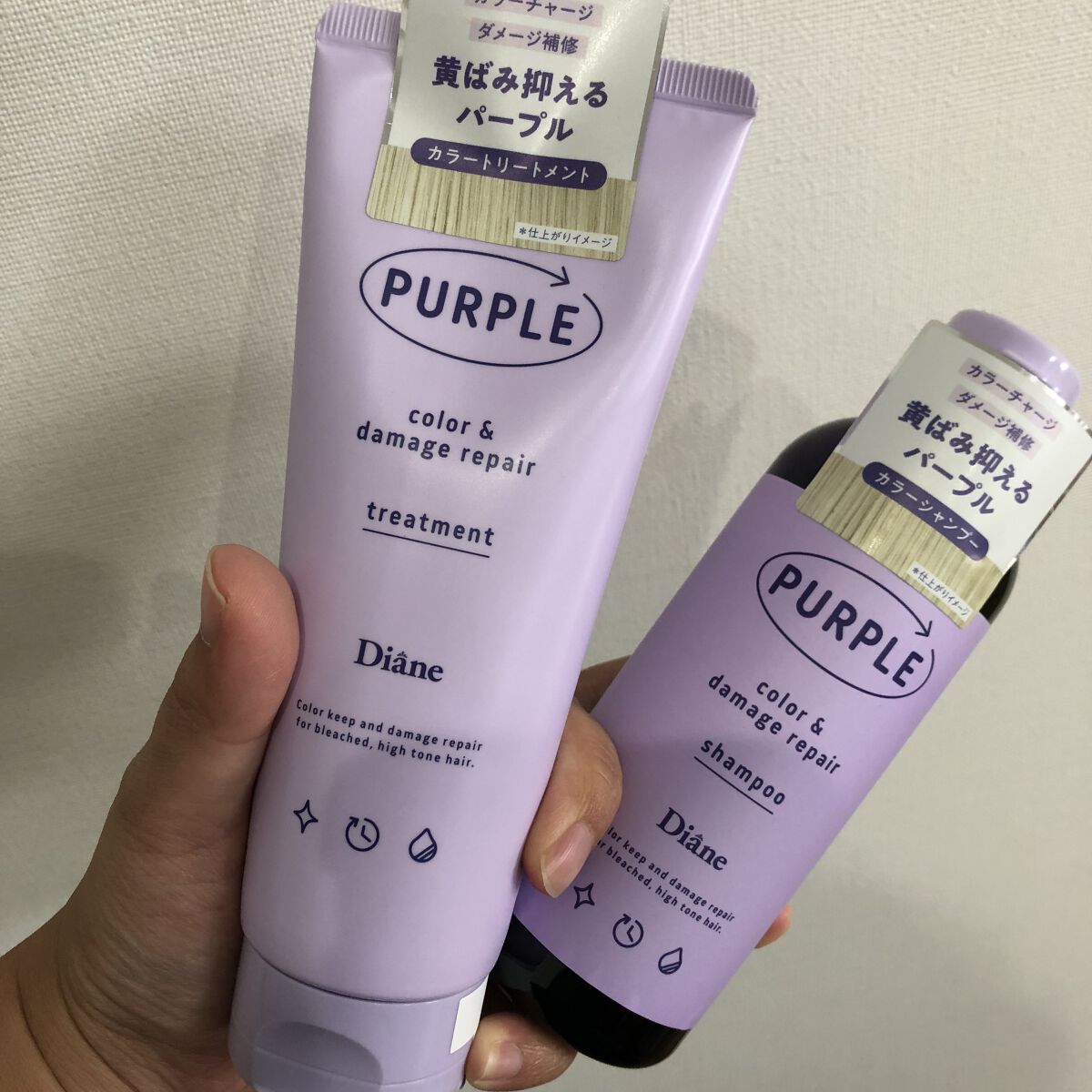ダイアンならいいかもと思い購入してみました。 香りよし、泡立ちよし、泡切れよし、軋みなし! シャンプーは濃ゆいムラサキ色の粘度の高めな感じ。 トリートメントはグレーにパープルが入ったような感じの色でチューブタイプです。 使い方はシャンプーを泡立てたら髪に揉み込んで3分ほど放置する方がいいらしい。 乾きもそんなに遅くなくて、さらっさらになるのでかなりお勧めしたいです。 シャンプーの種類は3種類あり 店舗で見かけたことがないのでAmazonで買いましたが翌日に届いたのでお店探すよりAmazonで買う方をおすすめします。 香りも良くてサラサラになって黄ばみも抑えられる!