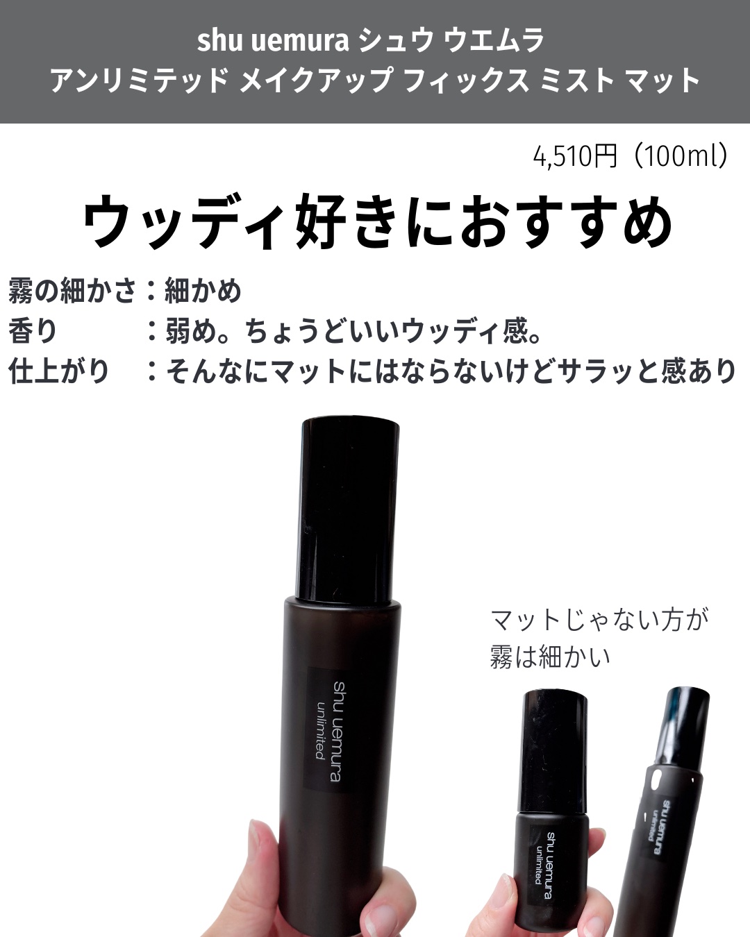 メイクの仕上がりを16時間キープするとのことで、確かに長時間綺麗な状態をキープできて感動しました! ミストの細かさは、ク〇〇ンスほどは細かくないけどけっこう細かい方だと思いました! 私は30mlのミニサイズを購入、持ち運びもしやすい👌 ⚠️ちょっと原料臭?みたいな匂いはあります!