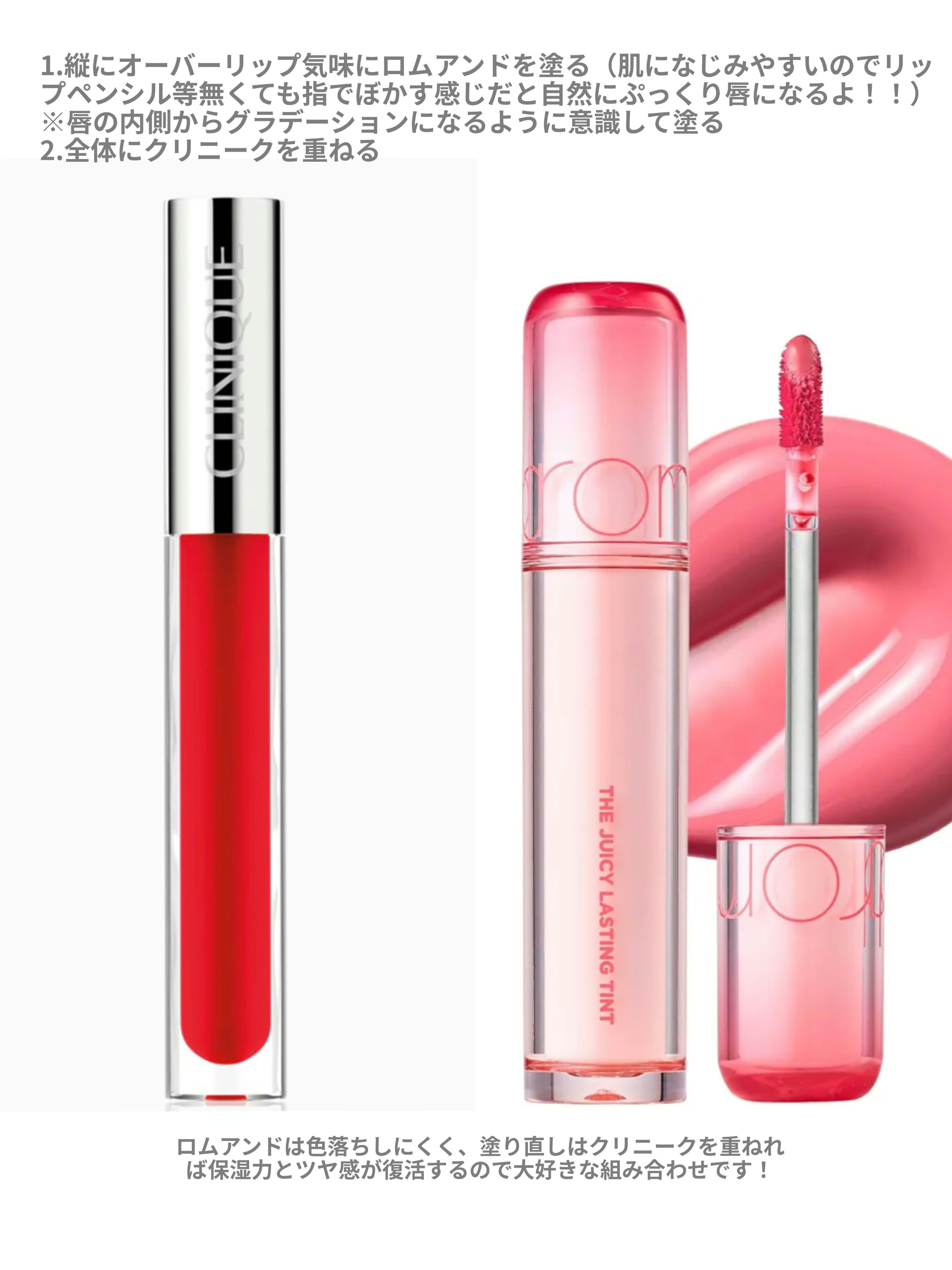 【ちゅるちゅる乙女リップの作り方】色味も保湿力も抜群な、個人的に大好きなツヤ感リップの作り方です。💄リップrom&nd ザジューシーラスティングティント 23ピーチピーチミーCLINIQUE ポップリッププラッシュ 04ジューシーアップルオーバーリップ気味にロムアンドのリップティントで唇の土台を作ったあと、クリニークのリップグロスを重ねます。ロムアンドの色持ちが良いので、塗り直しもクリニークのみでOKで、保湿力・ツヤ感がすぐに復活するので大好きです。(去年使いすぎでほぼもう底見えして無いです🥹👊)単体でももちろんどちらも可愛いですが、2つを重ねると本当に【うさぎ舌リップ】というか、ほどよい血色ながら蛍光にも寄らないし濃くもなりすぎないし、肌も色白に見えるので大好きです🐰💕