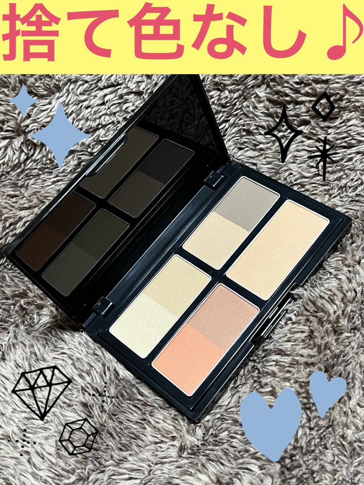 シェーディングをする 部位によって影の色は 色を使い分けるから 自然に陰影が作れる。 アイシャドウ、チーク、 眉、ノーズシャドウ、 唇上シャドウ、フェイスラインのシャドウ が詰まった珍しいパレットです。 全ての色がマットで 肌に馴染みやすいので 女性はもちろんなんだけど、 男性にも使えるコスメです! イエベとブルベに合うブラウンて 見極めが難しいのですが、 これなら自分の肌色に合わせれば いいので楽ちん!