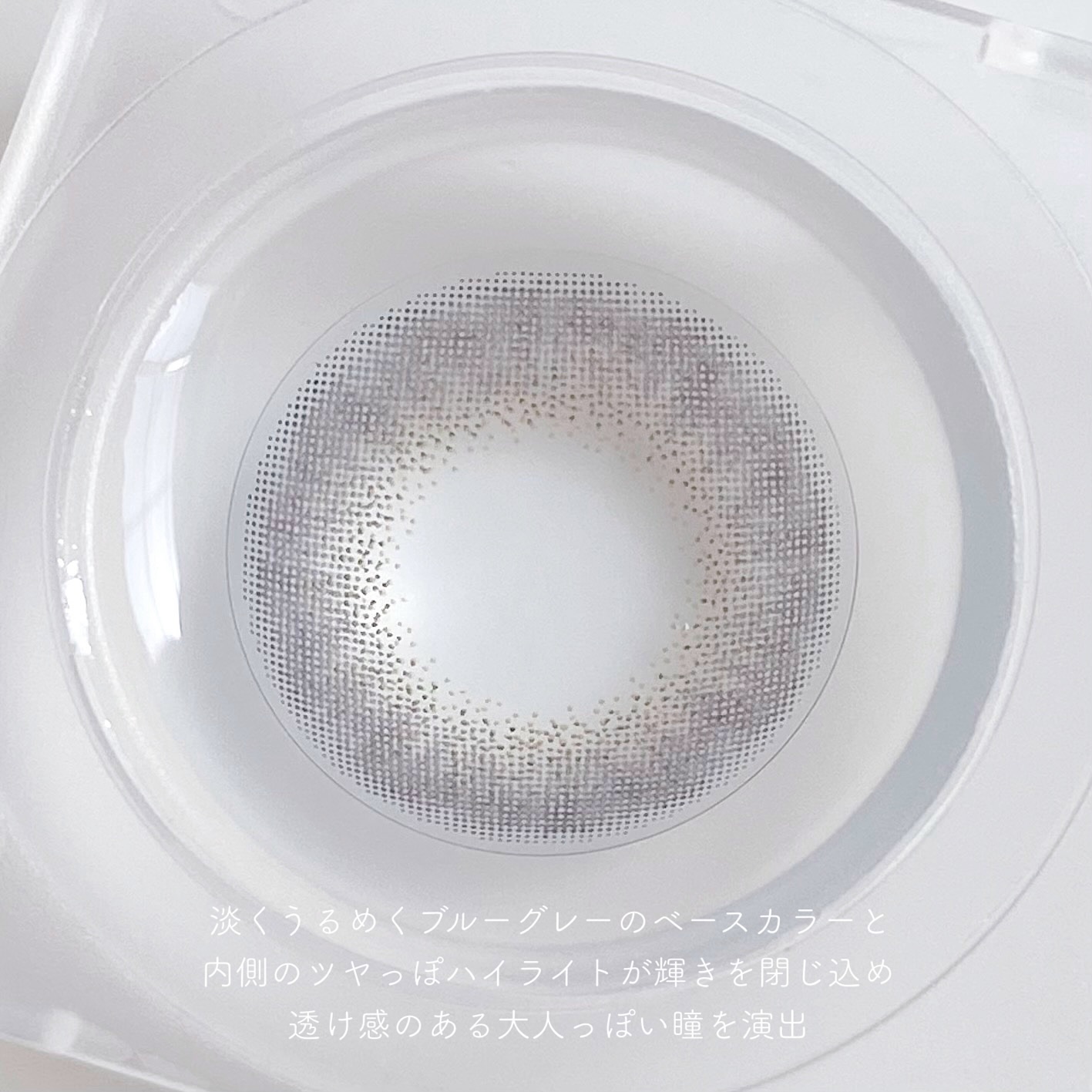 自分の黒目とブルーグレーが色を打ち消し合い透明な目ができる!🫥 水みたいにうるうるな瞳になるカラコン レンズだけ見るとちょっと青っぽいのかなと思ったけど実際に着けると自分の黒目と調和して透き通るうっすらした色合いになります🫧 意外と使いやすいグレー◎ 噂の純欲メイクにもぴったりなカラコンです!❤︎
