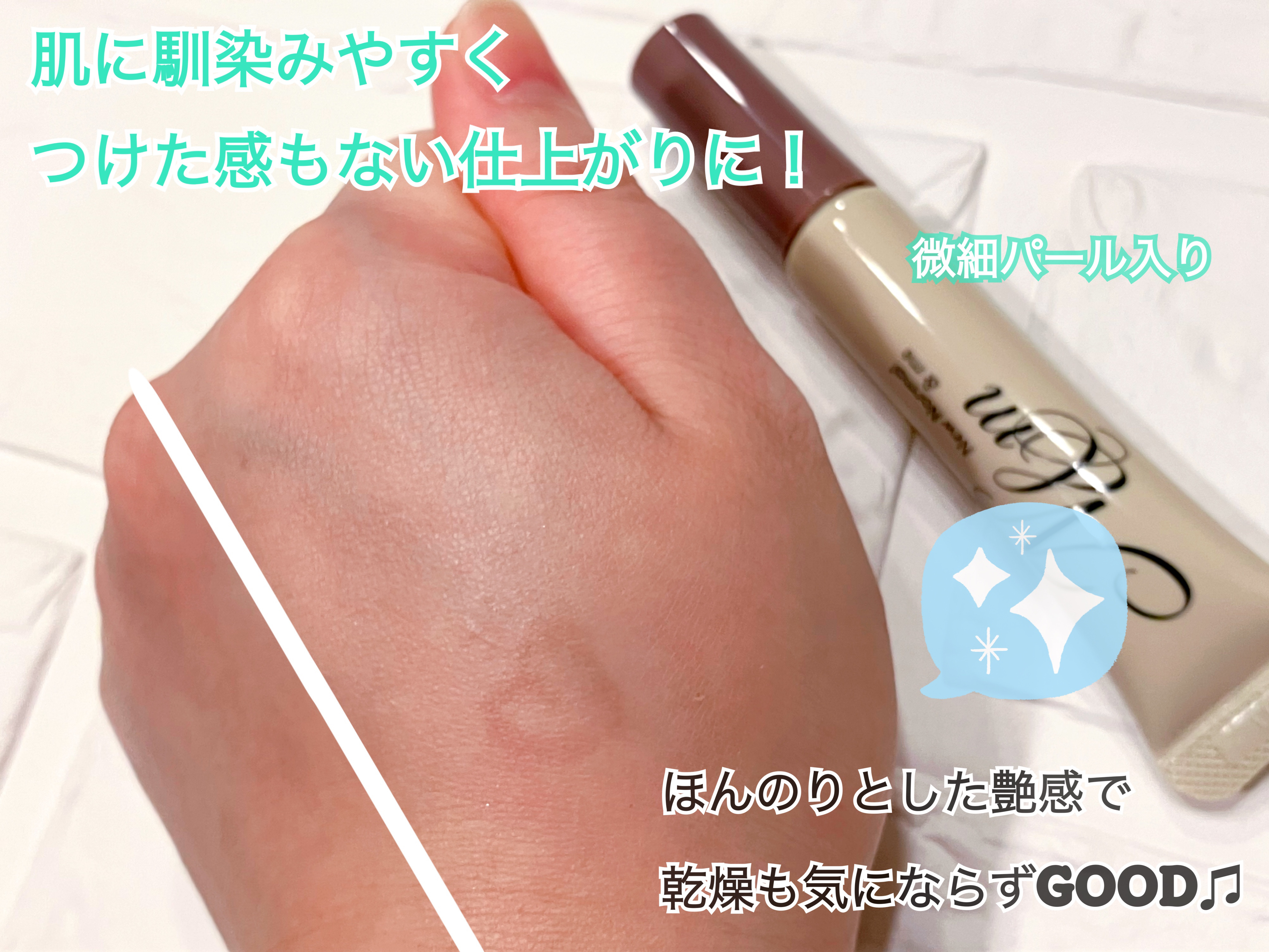 艶感でトーンアップ。保湿成分の3種のヒアルロン酸・3種のセラミド・ビタミンC誘導体・レチノールを贅沢に配合。 シンプルなコンパクトサイズのチューブタイプ。平筆タイプ。 軽く押すだけで筆にリキッドがしみ込んでササっと塗りやすい。みずみずしいテクスチャーで伸び馴染みがすごくいい。べたつきもなし。 少し白いかなって思ったんだけど馴染んでくれる。トーンアップ。微細なパール感でツヤ感がきれい。 カバー力は控えめなんだけどハイライト感覚で使うのにすごく便利。薄付きで肌馴染みがよくて厚塗り感がないので重ね付けもしやすい。 私的にクマ隠しにすごくおすすめ。使いやすさとツヤ感・トーンアップ、プチプラなのでおすすめ。