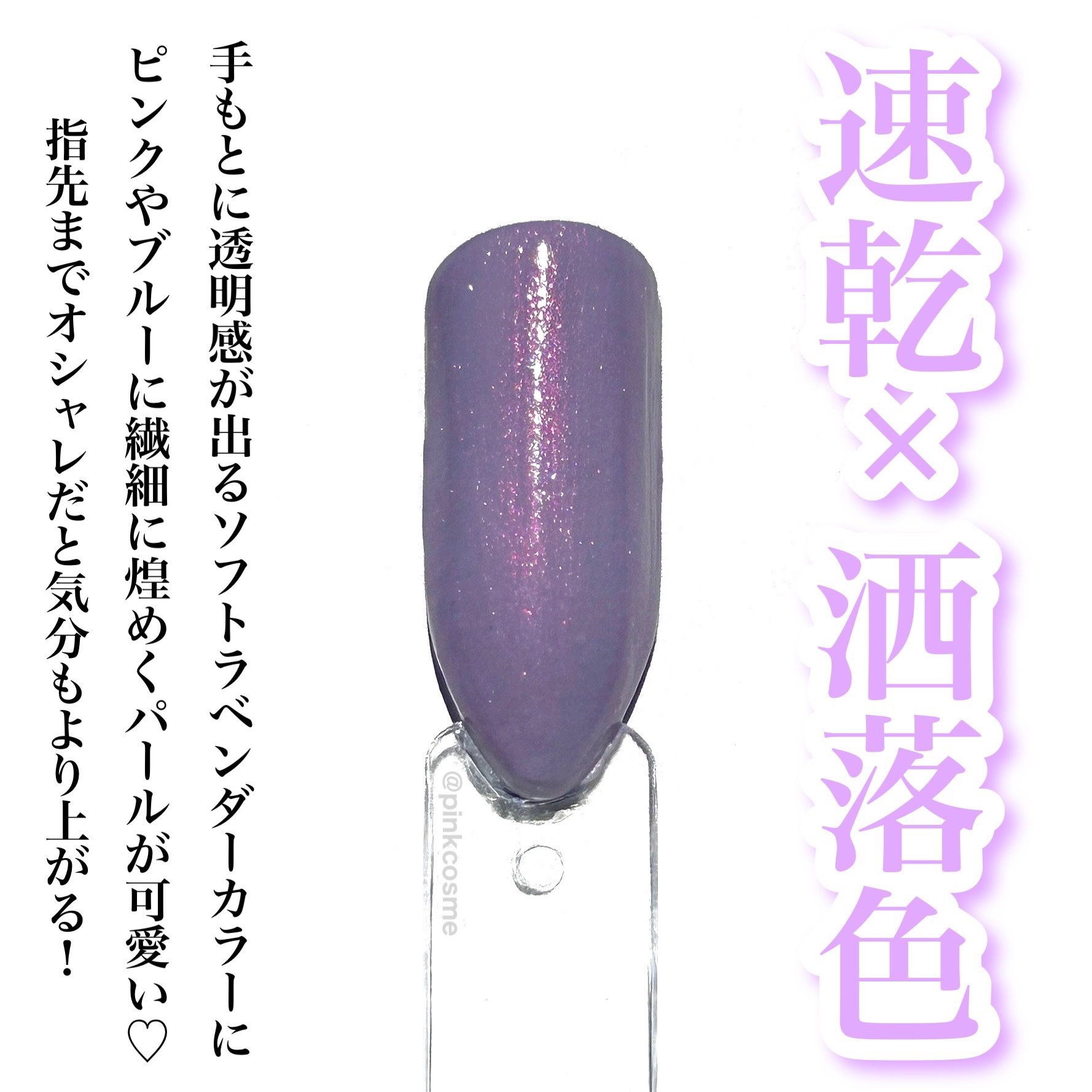 ソフトラベンダー色にラメが入っていて、ひと塗りしただけで、寒色系が苦手な私でも、これ可愛い❣️と虜になったカラーです✨ グリッターとパールが入っているラメタイプなので、ムラになりにくく刷毛も塗りやすいです♡ 乾きも早いので、そこも魅力的❣️
