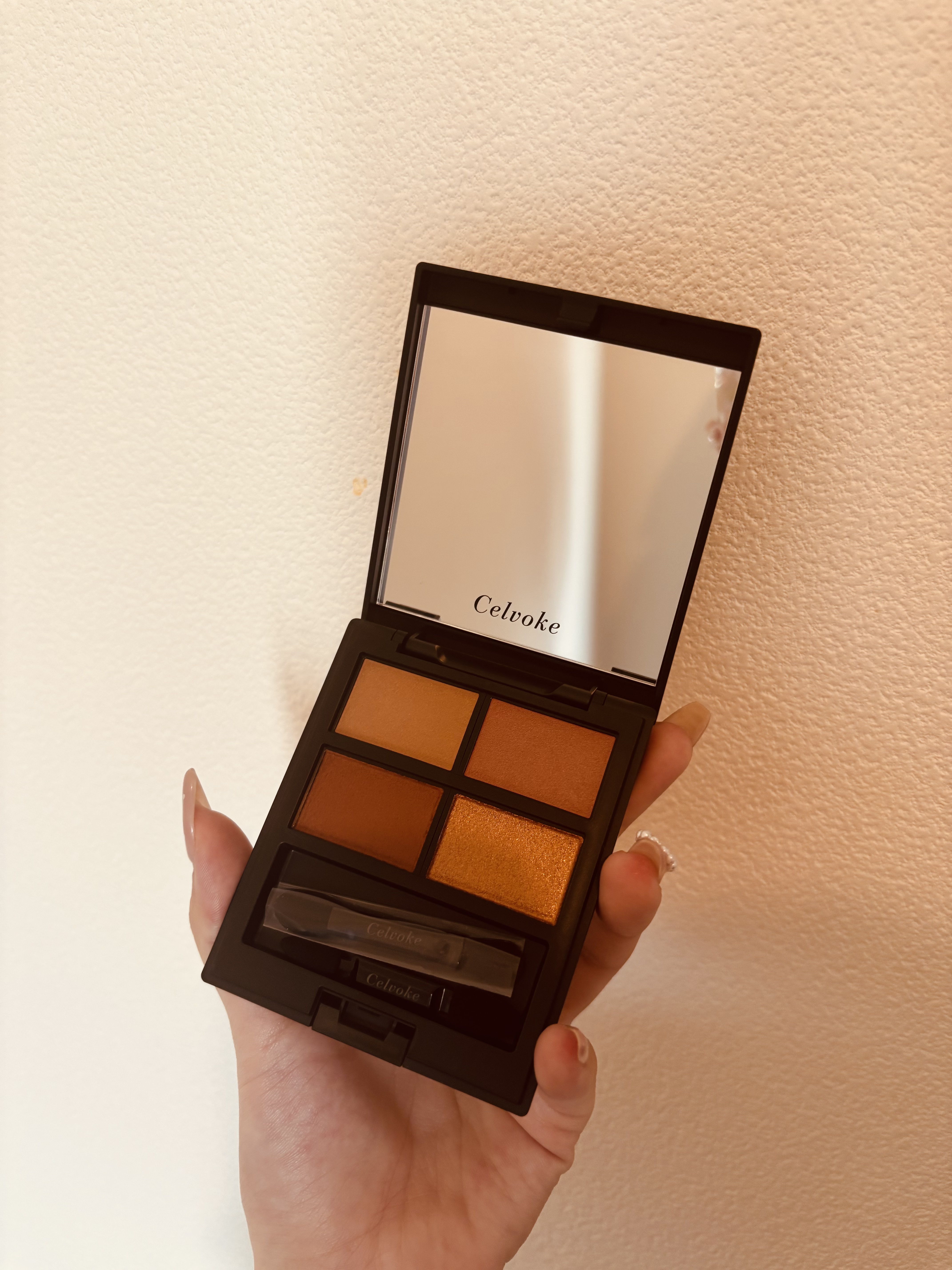 メイクしてみると「やはりCelvoke!!」という感じでパウダーのシャドウなのにジュワッとツヤ感を感じる発色でさすがのオシャレ感🥹✨ 右下のラメも細かめで派手さはないものの、ツヤキラな感じがかえってちょうどよくて◎だな、と思いました🤭 【左上】\ツヤを感じるマット/自然になじむ印影カラーでベースに◎ 【右上】\ツヤを感じるマット/コーラルよりのテラコッタカラーこのカラーが一気にオシャレカワイイ目元にしてくれます💕 【左下】\ツヤを感じるマット/ブラウンよりのテラコッタカラー暗くて濃いカラーのアイシャドウが苦手な私は締め色に使用しています。目尻に入れると目サイズ拡張効果が😳 【右下】\細かいラメ/唯一のラメシャドウ偏光コーラルのような細かいラメがツヤキラ感をあげてくれて◎