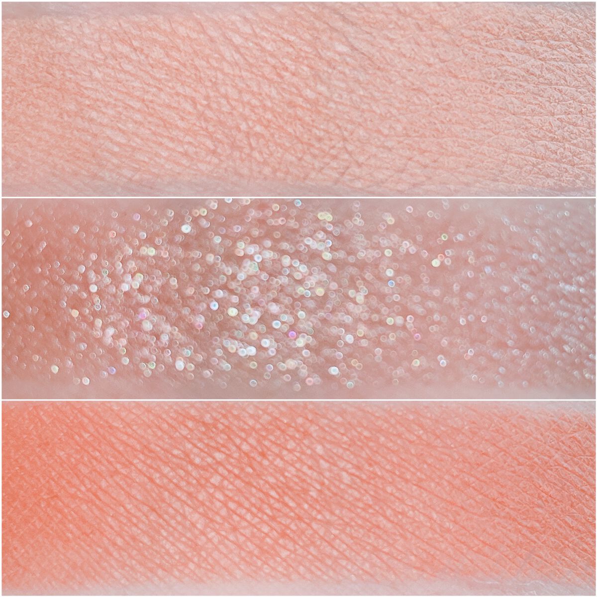 明るめのオレンジブラウンカラーでブラウンメイクなのに暗くならず目元を明るく見せてくれます 真ん中のラメは少しベージュがかったベースカラーにシルバーやゴールド、ピンク、イエローのラメが入っています 明るく柔らかいピンクカラーとくすみピンクカラーが可愛いアイシャドウパレット🎨 1番右のカラーは見た目より明るめに発色! 真ん中のラメは濃いピンクのベースカラーに青やピンク、ゴールドのラメが入っています マット系の粉質は柔らかくしっとりしていて高発色! ラメの粉質は柔らかくサラサラ!高密着で1日中ギラギラ輝いてくれます✨️ 粉飛びラメ飛びしないのでとっても使いやすいアイシャドウ!