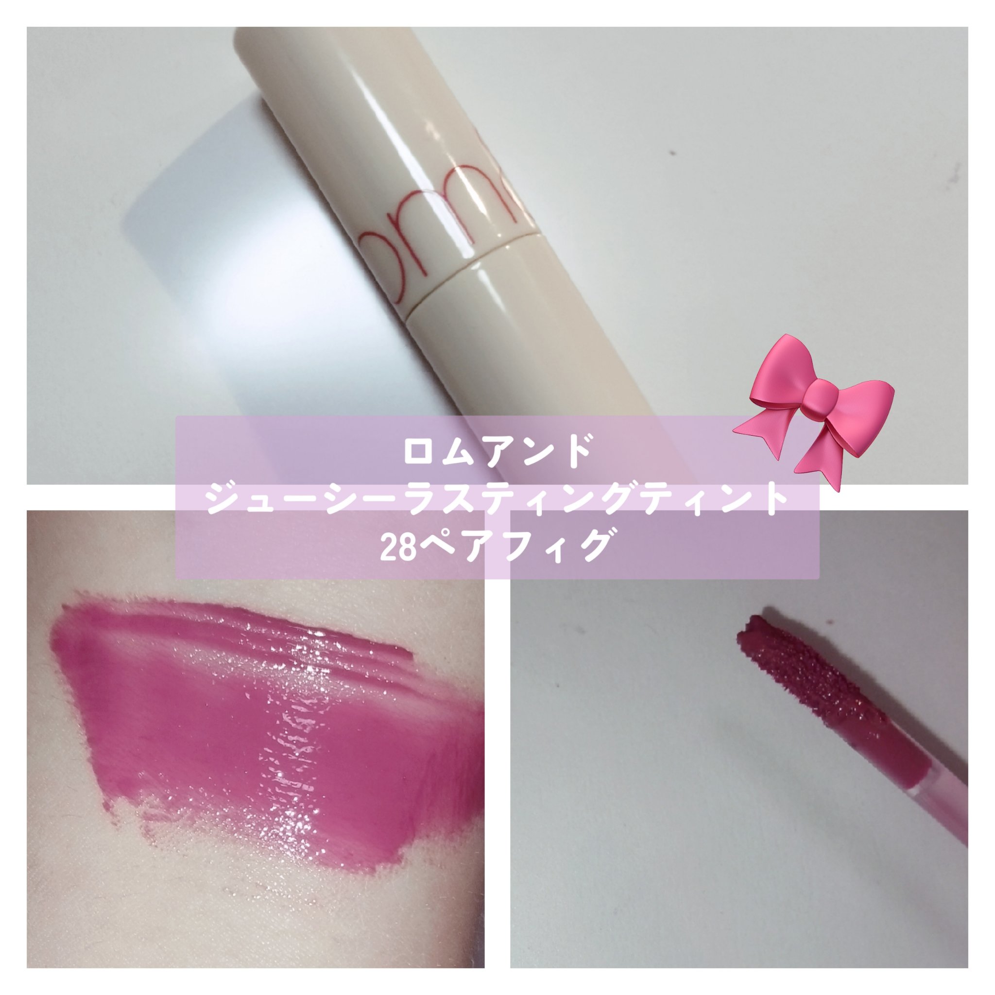rom&nd・ジューシーラスティングティント 28BAREFIG青みピンクが可愛いです◎濃い目の色味ですが唇にのせるとなじみます◎つけたてはツヤツヤで◎ティッシュオフするとツヤ感は無くなりますが色残りは◎青みピンク系大好きなのでセットの一つで...