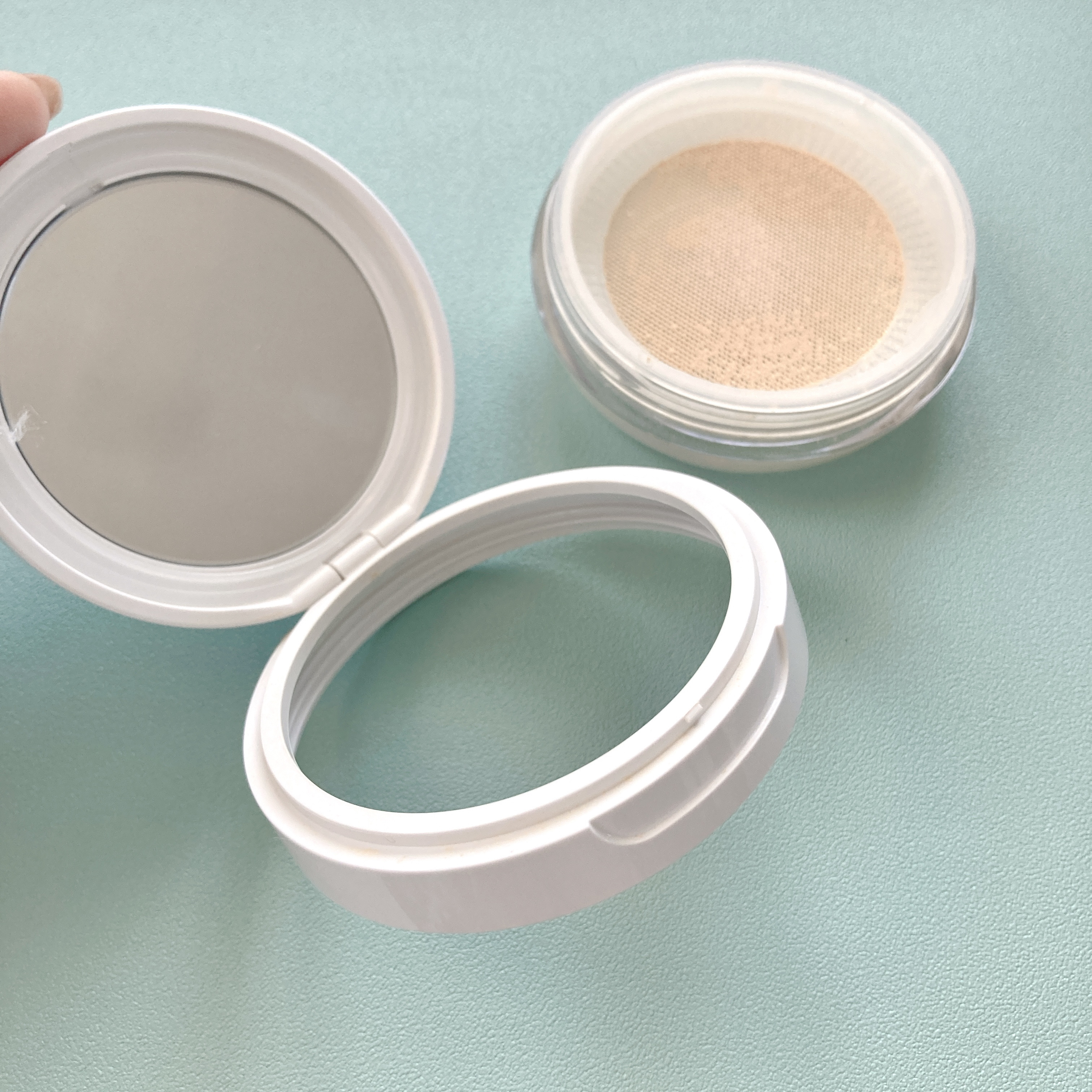 シリーズの中では1番カバー力があるベージュ。ひとつ使い切ったので再購入しました。毛穴が隠れますが乾燥しすぎないので大人におすすめ。ややオレンジ系のベージュなので美白ケアを頑張ったら色が少し合わないように感じてはじめてきたので手持ちの真っ白なパウダーと混ぜて調整しています。詰め替えたあとのケースは小物入れに使ってます。笑別購入のケースもメッシュタイプで使いやすいです。