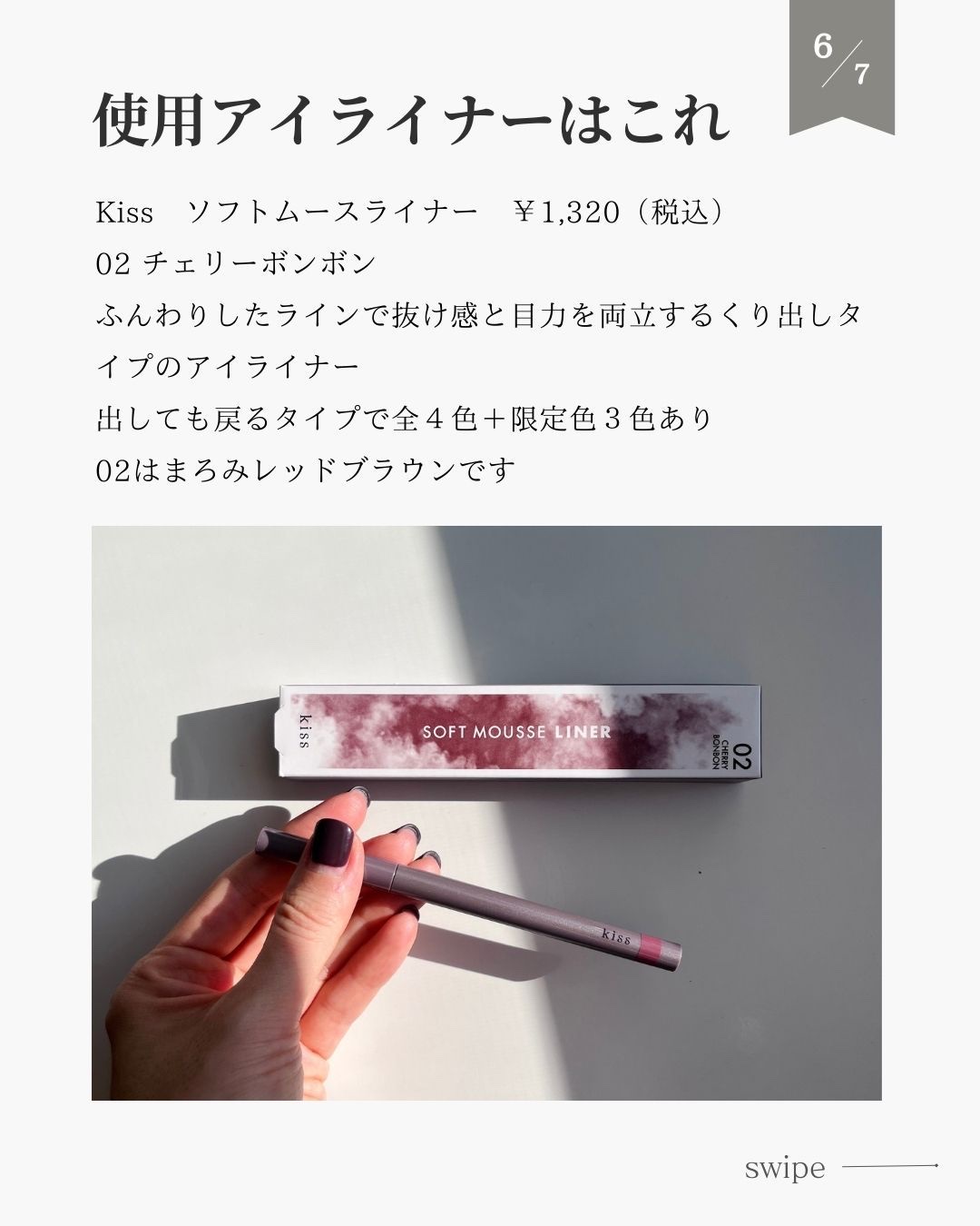 スルスルと描けて、柔らかい発色のラインが抜け感と目力を同時に叶えてくれます💭 私はあまり二重幅が広くないので、締め色が苦手なのですが、このソフトムースライナーを目のキワに塗ったらデカ目に見えてちょっと感動😳 描くのが苦手だった地雷盛りラインも簡単に描けました!