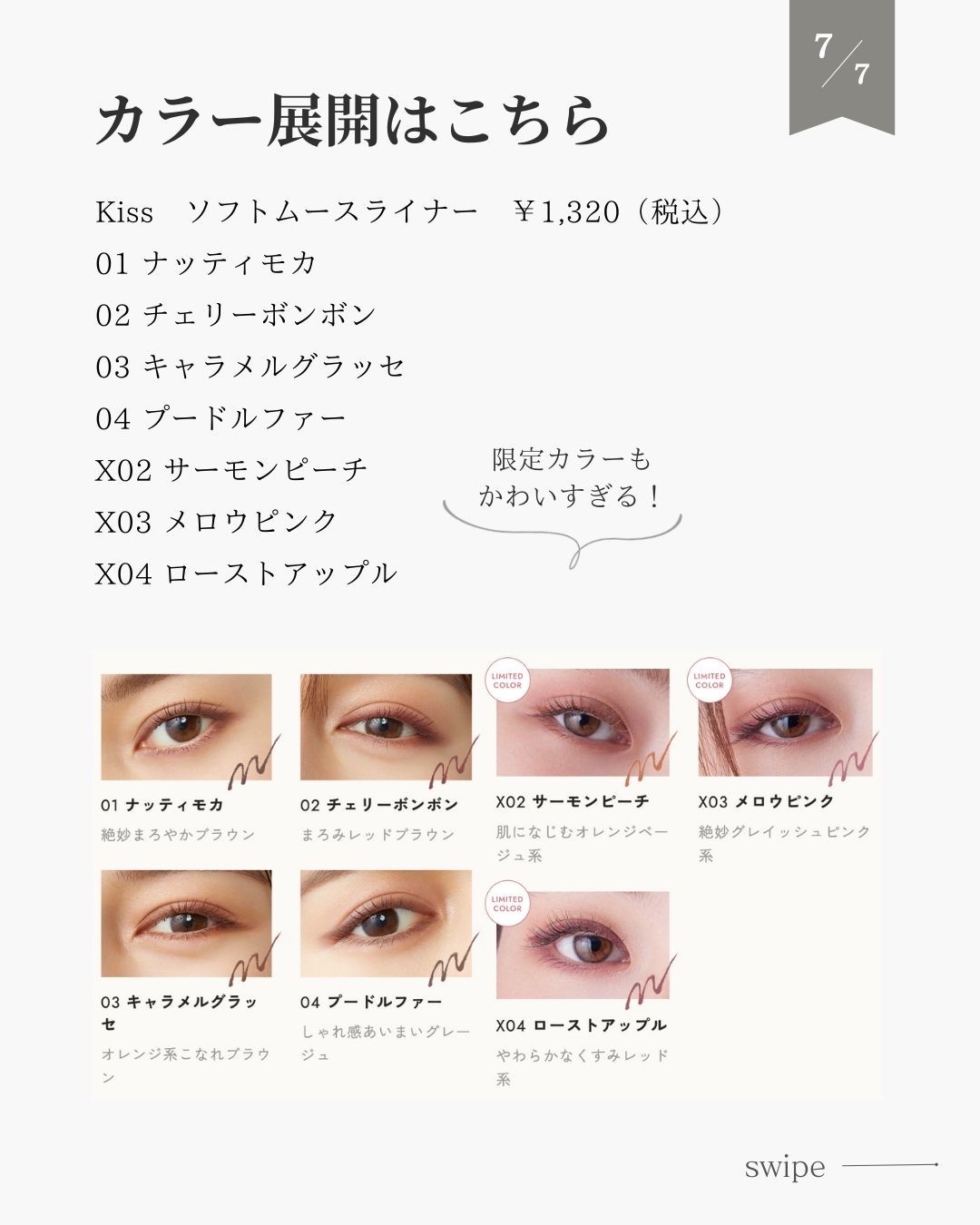 kissソフトムースライナー芯が柔らかくて、肌への負担も少ないし、どのカラーも最高に可愛いのでぜひ試して欲しい✨️👏🏻上から、01ナッティモカ絶妙まろやかブラウン02チェリーボンボンまろみレッドブラウン03キャラメルグラッセオレンジ系こなれブ...