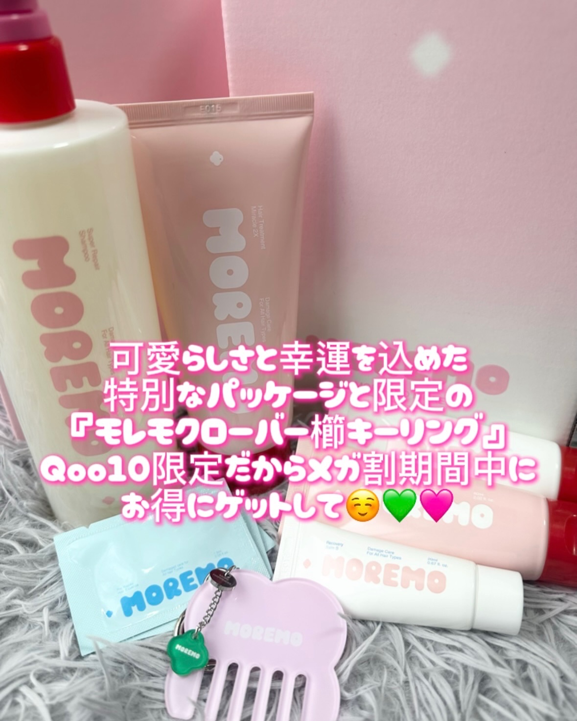 MOREMO、リニューアルしたの知ってたー?🍀なんかポップなパケになってめっちゃかわいい♡MOREMOHAPPINESSヘアケアセットQoo10で限定発売中だよん🩷段階的集中栄養とダメージケアでやわらかな髪を目指せるよん🧏♀️💝やっぱりいつもさらさらな髪の毛でいたい♡♡♡まだまだ乾燥が気になるけどパサつきに負けずなめらかな手触りヘアになっちゃおう☺️🧡シャンプーとトリートメントはレモンベルガモットムスクの香りで甘すぎず、さわやか🍋💚このセットめっちゃ使い心地いい🥺🥺それだけでもお得なのに限定グッズの🍀モレモクローバー櫛キーリング🍀ついてくるから見逃せない!😵可愛らしさと幸運を込めた特別なパッケージのMOREMOHAPPINESSヘアケアセット🍀メガ割でお得にゲットしてね🫶🦋💜#PR#moremo#Qoo10メガ割#ヘアケア