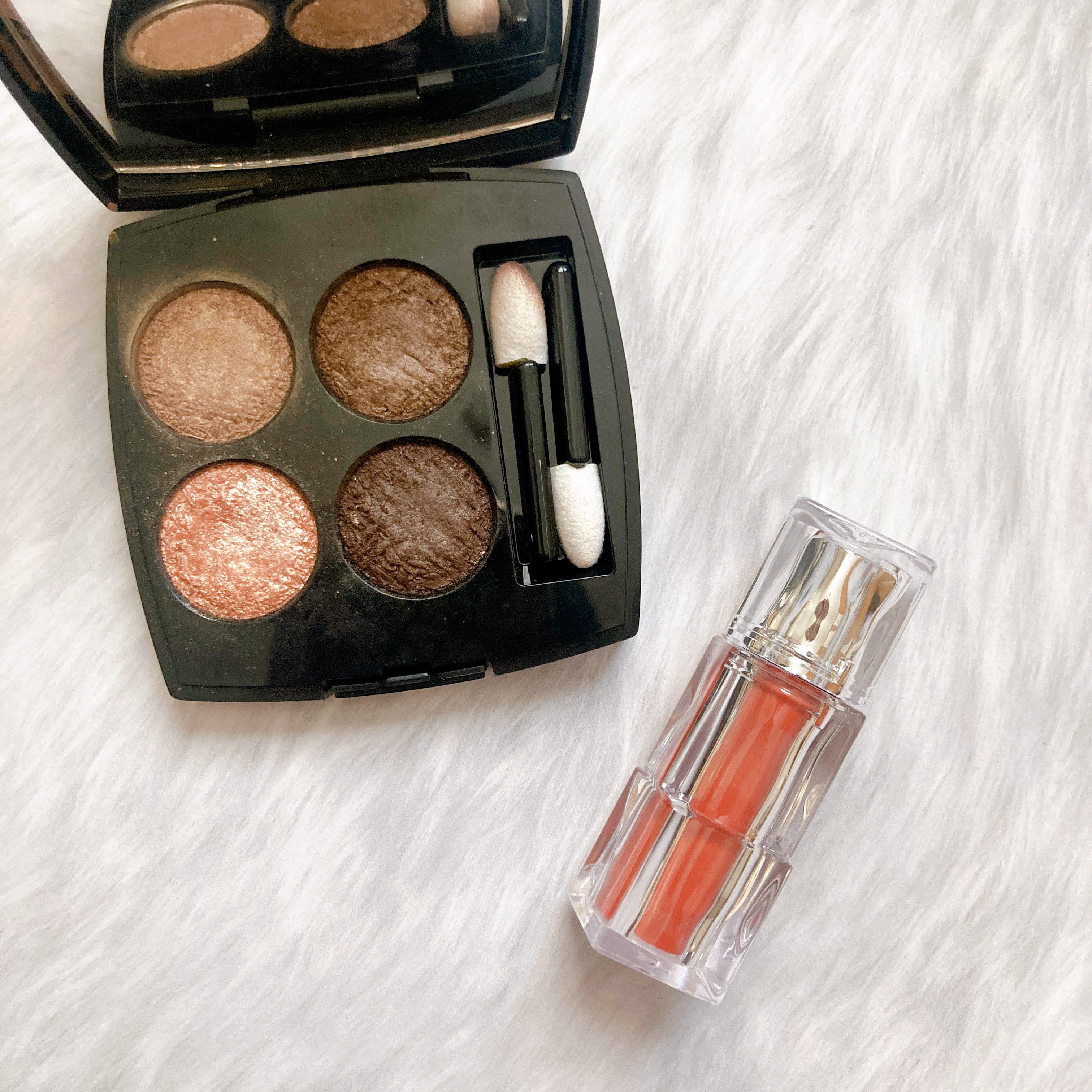 *CHANEL レ キャトル オンブル ツイード 左下のラメの煌めきがひときわ美しく1番心惹かれたカラーでした。(((本当は4色全部欲しい))) 今回やっぱり目を引くのは職人さんが、ひとつひとつ手作りされているツイード生地のポーチ。 ツイードの素材の手触りがアイシャドウの型押しにも表現されていてブラシやチップでとるときにゴリゴリ感を味わえます。ナニコレ、オシャレ。 04番はチョコレートブラウン、ピンクベージュ、プラチナローズのラメなどが入ったほんのりくすみ系ローズブラウンパレット。 なんか近くでじっと見てるとケーキの上とかによくのってるわしゃってしたチョコを削ったやつにも見えてくる。 シャネルのパレットはこれで2個目なので感慨深い感傷に浸りながらメイクしました。 今回カメラで表現しにくく、アイシャドウの色味が伝わりづらいと感じたのであえてマスカラで仕上げる前のアイシャドウのみの目元ものせてみました。