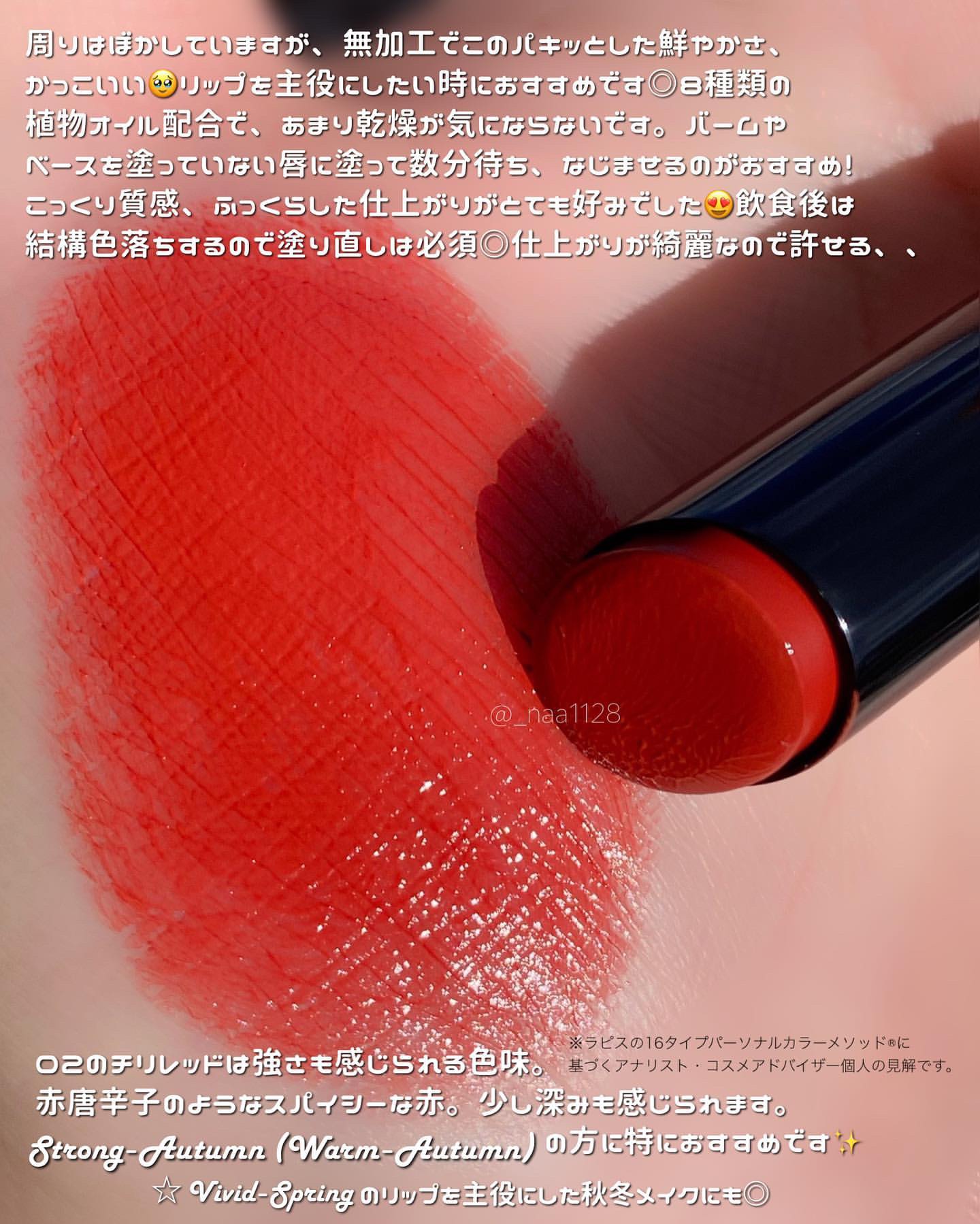 このリップ、開けるときの仕様が素敵すぎる!!リップの上部を、押すとカチッと出てくる。 アラフィフには、#必殺仕置き人#必殺仕事人を想起したよ(笑)格好いい。 #C002スパイシーな強さで魅せる チリレッドの色味は、明るい赤で太陽の下で映える。唇もふっくらとした仕上がり、透け感のある発色で色白の肌に似合った。 最近は色名も可愛らしくて、いろいろなリップを集めたくなる。