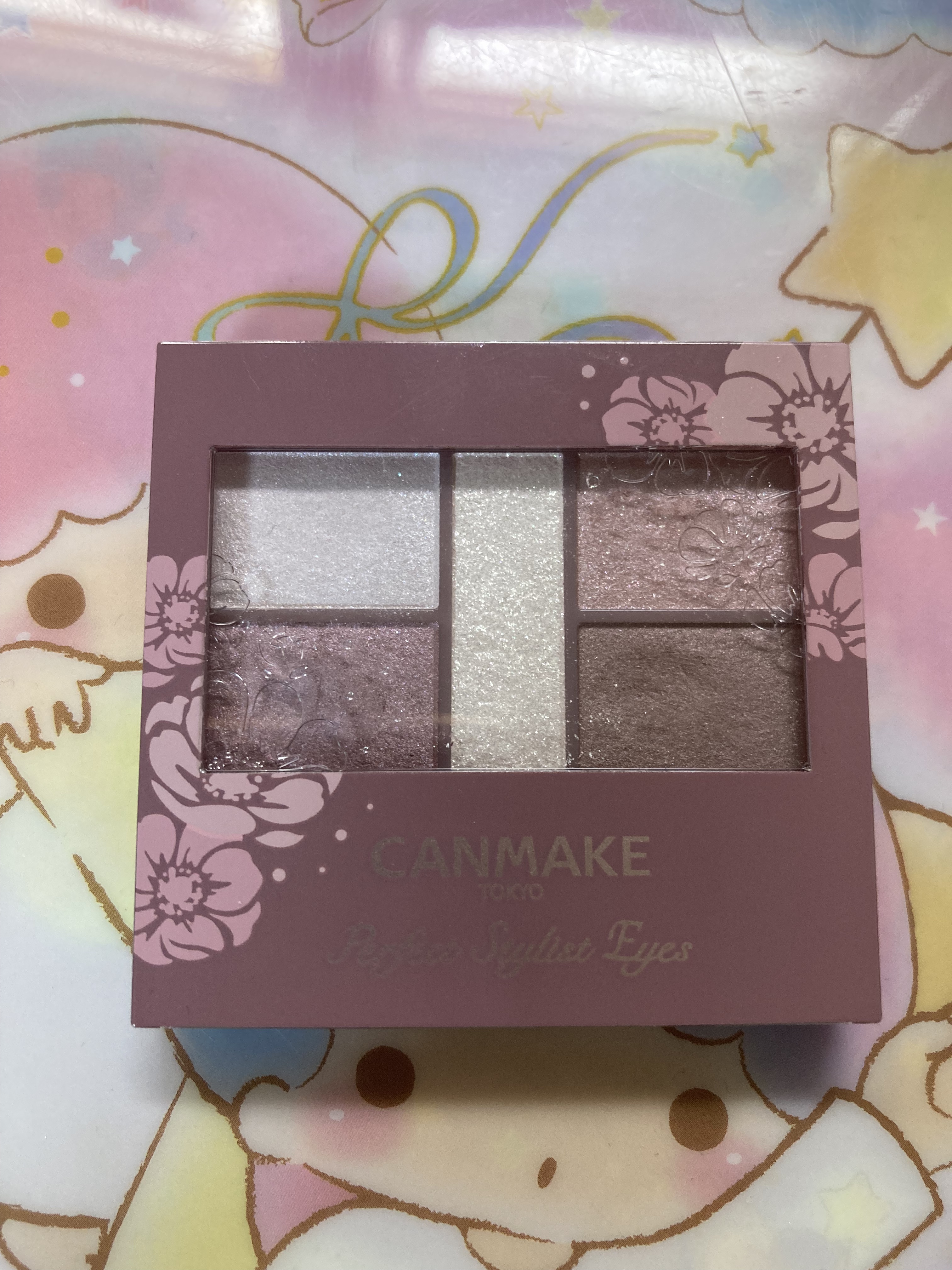 キャンメイクパーフェクトスタイリストアイズ26ミラージュモーヴ廃盤品とのことで、古いのを覚悟してアウトレットストアで購入。色味が絶妙で、ブルベ冬の私に合いました。真ん中のラメは使ってません。色持ちや崩れはデパコスに比較しちゃうと、叶わないけど...