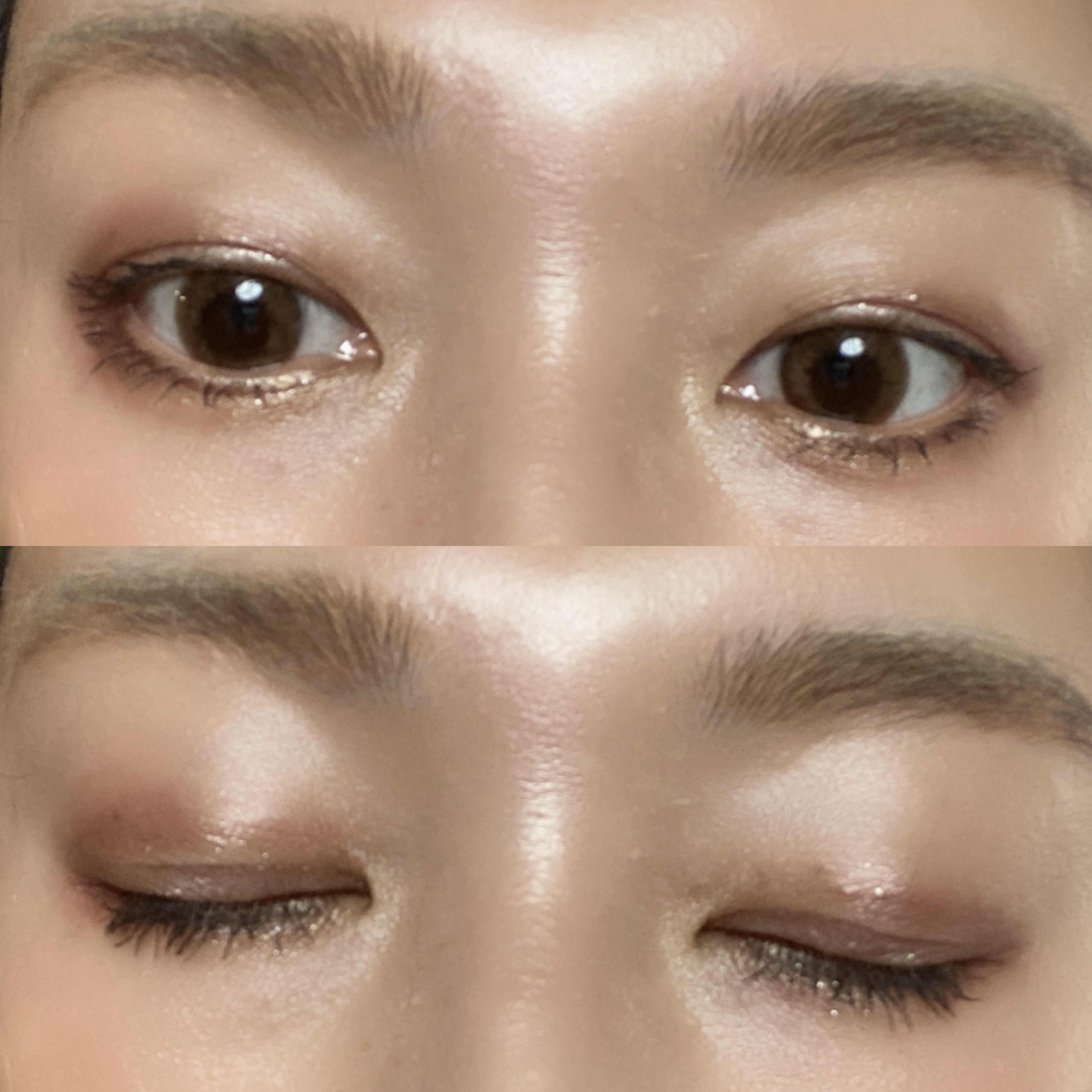 そして真ん中のラメがさぁ、ほんとにきれいなの。 店頭でハッと立ち止まってしまったくらい好み。 涙袋に右上、目尻に右下、アイホールは左上を二重幅に塗ってから右上で境目ぼかし、黒目上と下に真ん中のラメ。