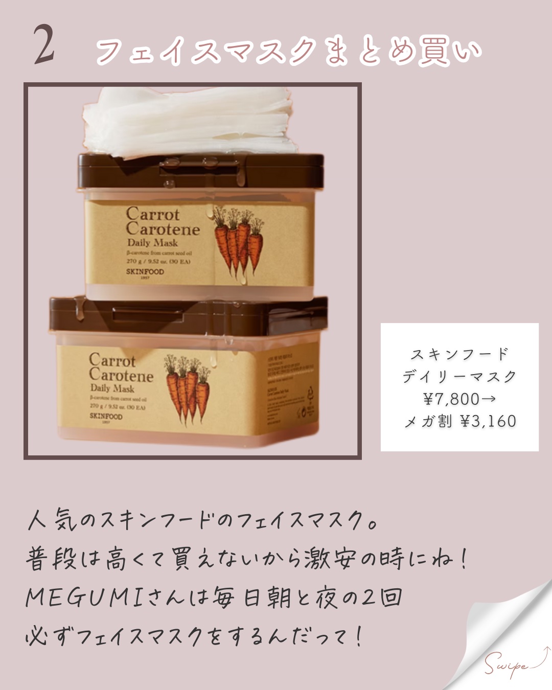 MEGUMIさんの、美容本読んでとーっても参考になりました✨今まで顔ばっかり気にしてスキンケア使っていて後回しになっていた、首やデコルテ、髪のナイトキャップなど。 唇の角質ケアも怠っていた!年齢を重ねたら、首と、髪は大きく印象が変わる!首は特に、一度シワが出来たらなかなか消えないし、消すにも首のシワの美容医療はとてもお金がかかるそうです。なので、首もシワが出来る前に今からケアしなくては!と思いました。美容本買って読んでみて、今回のQoo10メガ割でしっかり買いました♪#Qoo10メガ割#お守りスキンケア情報#シワ改善#韓国コスメ#スキンケア#MEGUMI#芸能人美容法#美容法#celimax#ノニリフレッシュクレイマスク#SKINFOOD#キャロットカロテンデイリーマスク#シルク枕カバー#ナイトキャップシルク100%#リンクルフィットネックマスク