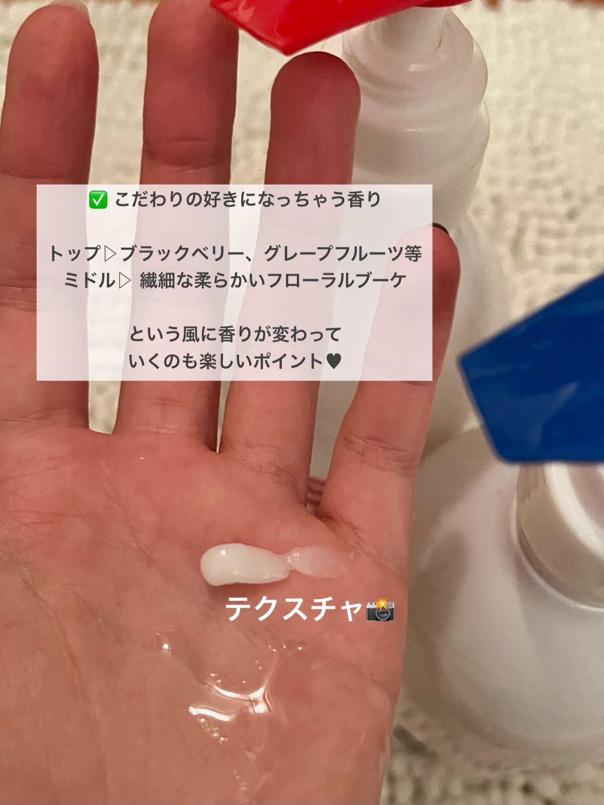 泡立ちが良く、洗浄力は強すぎないので乾燥しやすかったり敏感な頭皮の方にも🙆🏻♀️ ドライヤーで乾かすと根元がふわっと立ち上がり毛先はするんとまとまる理想的な仕上がり。 また、特に印象的だったのは香り! 洗っている時は果実系の爽やかな香りだな~~と思っていたのですか、ドライヤーで乾かすとフローラルっぽい香りになっていてびっくり🫣 最初は勘違いかと思ったけどなにやら香水のようにトップノートとミドルノートが存在するらしい💡´- これが好きになっちゃう香りか~~! まんまと好きになっちゃったわたしでした👧🏻
