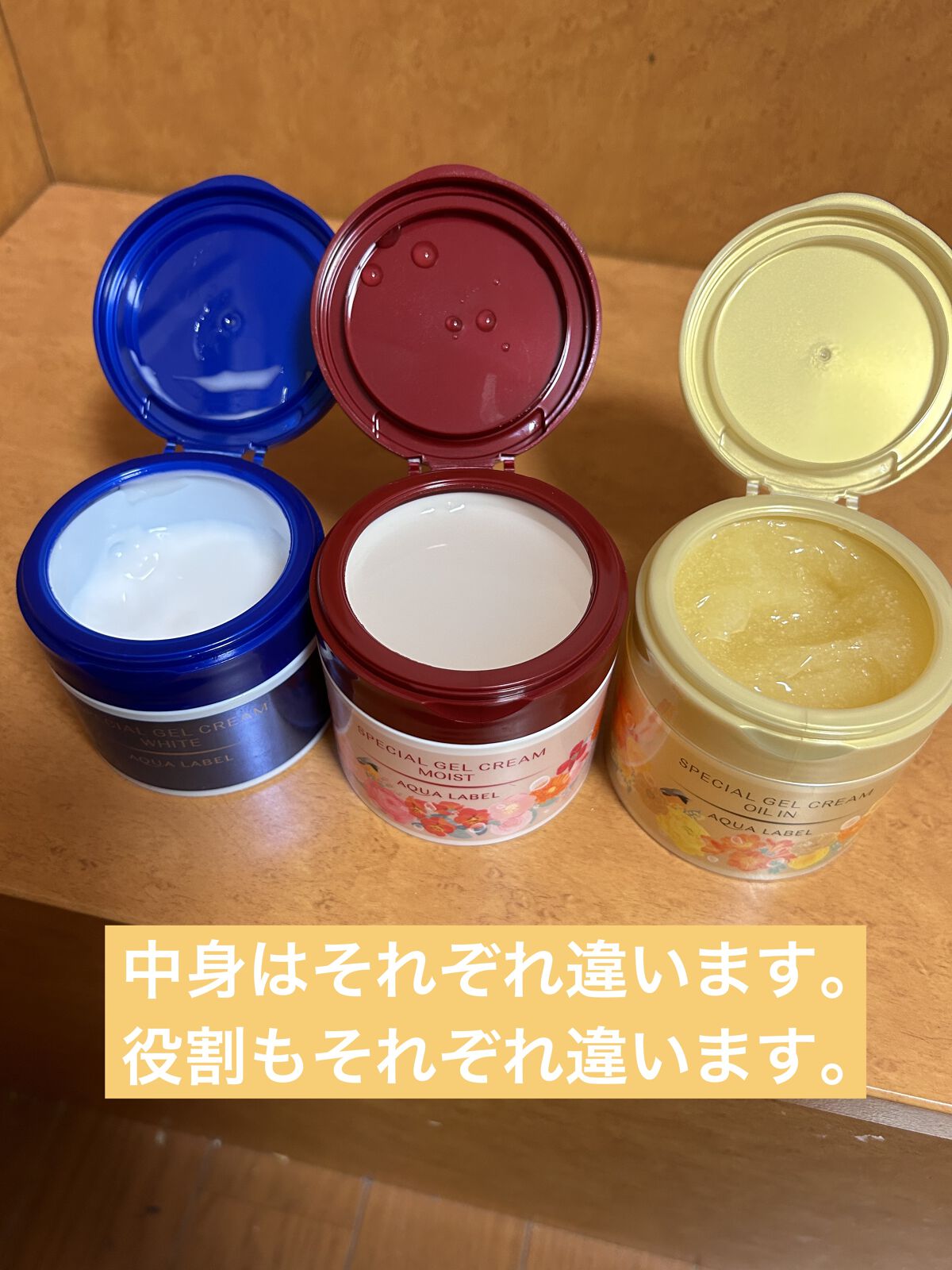テクスチャーはツブツブ入りのとろみをつけた片栗粉のよう。 オイル入りで重いかと思えばスッと入って行きます。 金のアクアレーベルはオイルイン。こちらは金のアクアレーベルに入っているレチノールが入っていない為、金のアクアレーベル使いたいけどレチノール負けする人にはお勧めの一品。日中も気にせず使用出来ます。 美白に特化💙青、ヨーグルト状のソフトでみずみずしいテクスチャー。 保湿、肌荒れ対策❤️赤、わらび餅のようなもちもちしたテクスチャーであり形状記憶ジェル。 エイジングに特化💛金、ツブツブ入りの片栗粉でとろみをつけた感じのオイルインジェル