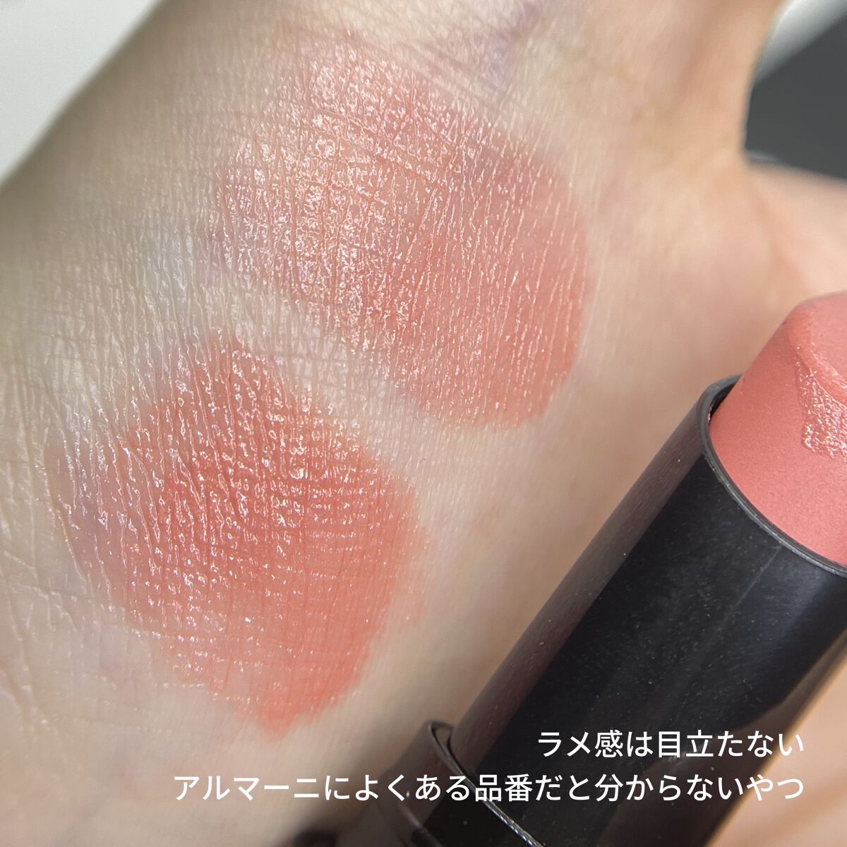 スティックタイプにしては色持ちも良くて、ドロップ型がすごく塗りやすい。 つけ心地がとても良いです。 落ち方も自然で、食事をしていても色が少しずつ薄くなるような、綺麗な落ち方をします。 このシリーズは香料もなく、原材料のにおいもしないので、結構万人ウケするんじゃないかなと思うんですが、LIPS内でアルマーニのクチコミ書いてるの、私がかなり多いと思うので、愛用してる方いらっしゃったら是非!書いてください!! ブラウンリップが似合わないんですが、201は何故か使える。 303はパキッと鮮やかなオレンジです。 404は、暗めの赤。ボルドー系です。 502、503は誰でも似合うナチュラルめの万能ピンク。 504はいっきに暗めのカラーで、404と似たような雰囲気です。 写真にない113は暗すぎないローズピンク。