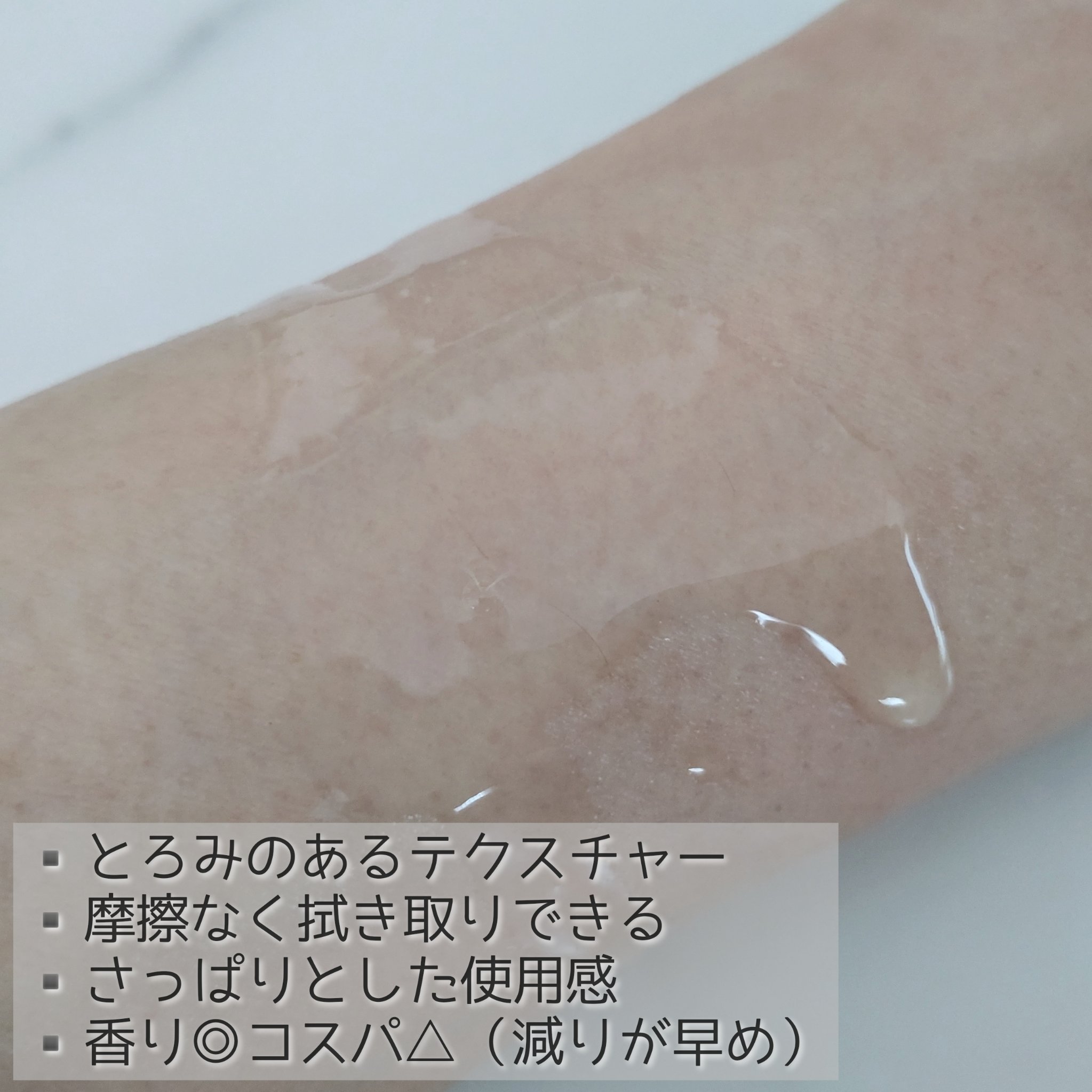 🔸とろみのあるテクスチャー 🔸厚みがあって摩擦なく拭き取りできる 🔸ベタつかず、さっぱりとした使用感🎶 🔸香り◎ 🔸コスパ△(減りはやや早め💦) 使用感はすごく良いです✨ とろみがあるので、使用量が多くなりがち。 100mLでは少ない‼️大容量がほしい😆 リピあり🎶