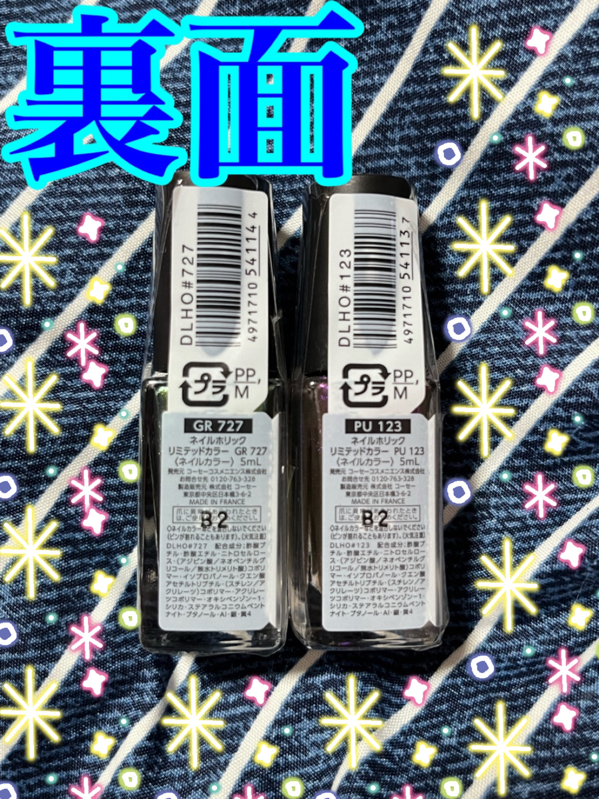 爪に塗ると最初は薄付きですが、3度塗りをすると自爪が見えなくなるほどの高発色になりました。 瓶に入ってるときは、向きを変えたりすると緑やオレンジ色のラメが見えるのですが実際に爪に塗るとを紫のラメだけが見える感じになりました。わかりやすい表現だとパール紫。 ネイルホリックは乾くのも早いから好きです。3度塗りで3分くらい。4度塗り〜は5分くらいで乾きました。