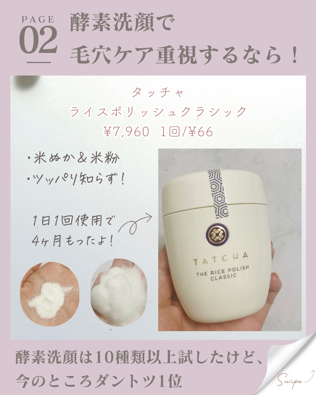思ってたより泡立ちが良くて、使い続けて思う、ごわごわ感が減る。 特に毛穴が気になるとことに使うと、刺激をあまり感じず◎ 酵素系ってきくと毎日使用ためらうけど、これは普段使いしやすいのが魅力的。 季節や肌質に合わせて展開があるので、他のパウダーも気になる... ちなみにタッチャのどのも商品も独自成分配合→HADASEI-3 和食にインスパイアされた成分配合なので、日本人により合ってるのかなって印象...