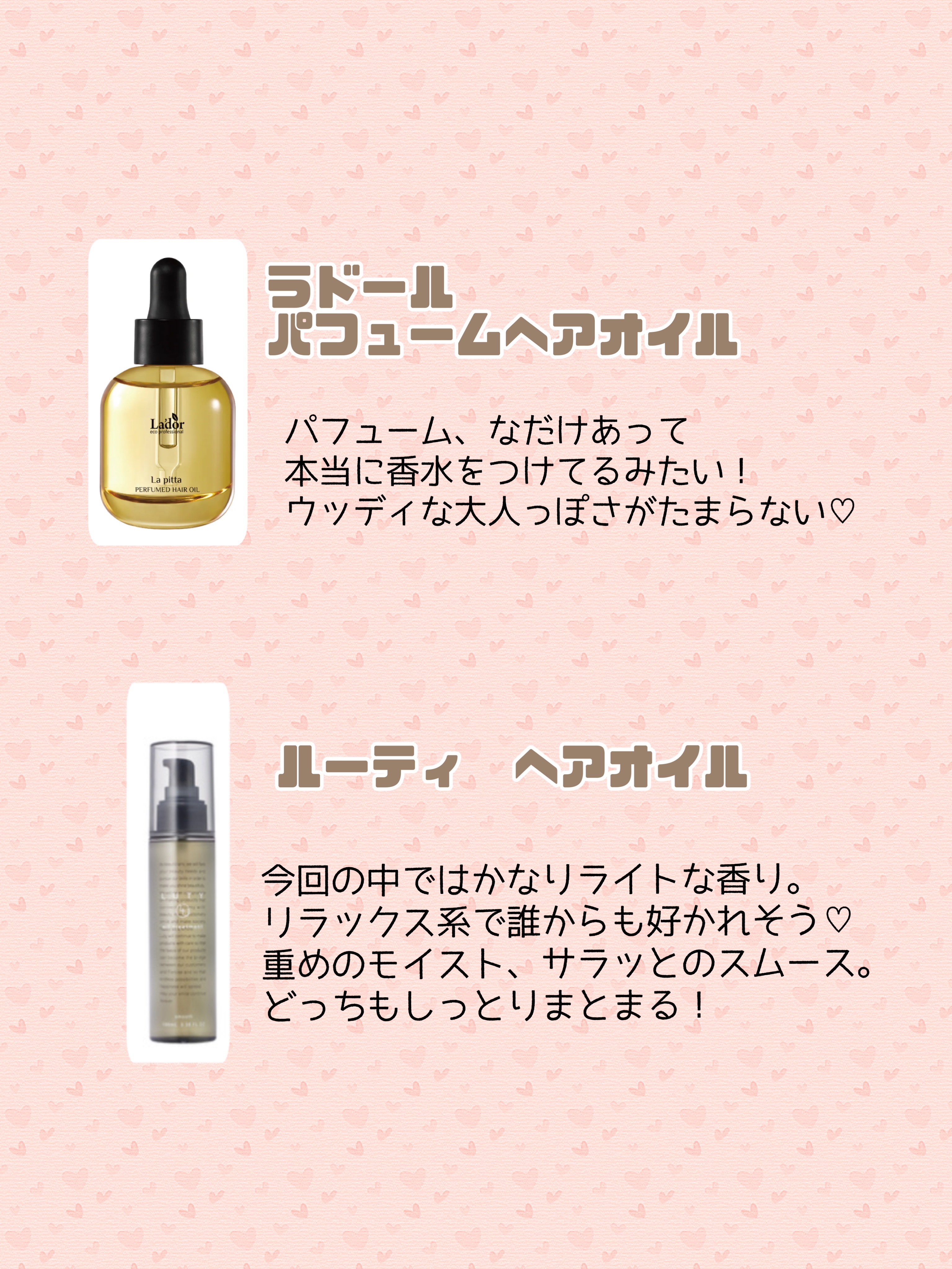 LUTYルーティーヘアオイルスムースドライヤーを購入した際に特典としてついてきたLUTYのヘアオイルスムースを使用していますアミノ酸系CMCが配合されており、毛髪内の水分バランスを正常化して栄養分の浸透をサポートしてくれるとか。さらに、髪にツヤと潤いを与える数種類の植物オイルが配合されているようです🌸スムースのヘアオイルでは、髪にハリコシを与えるシルクや黄金海藻エキスなどが配合されているため、細く柔らかい髪にも合うようです。私は太く硬い髪ですが…😂でもオイルでこってりしてるけどベタつかず、ほのかにいい香りで使い勝手良かったです。ドライヤー後の指感触も割と良い⭕️ここまで読んでいただきありがとうございます#ふわツヤ秋冬ヘアレシピ