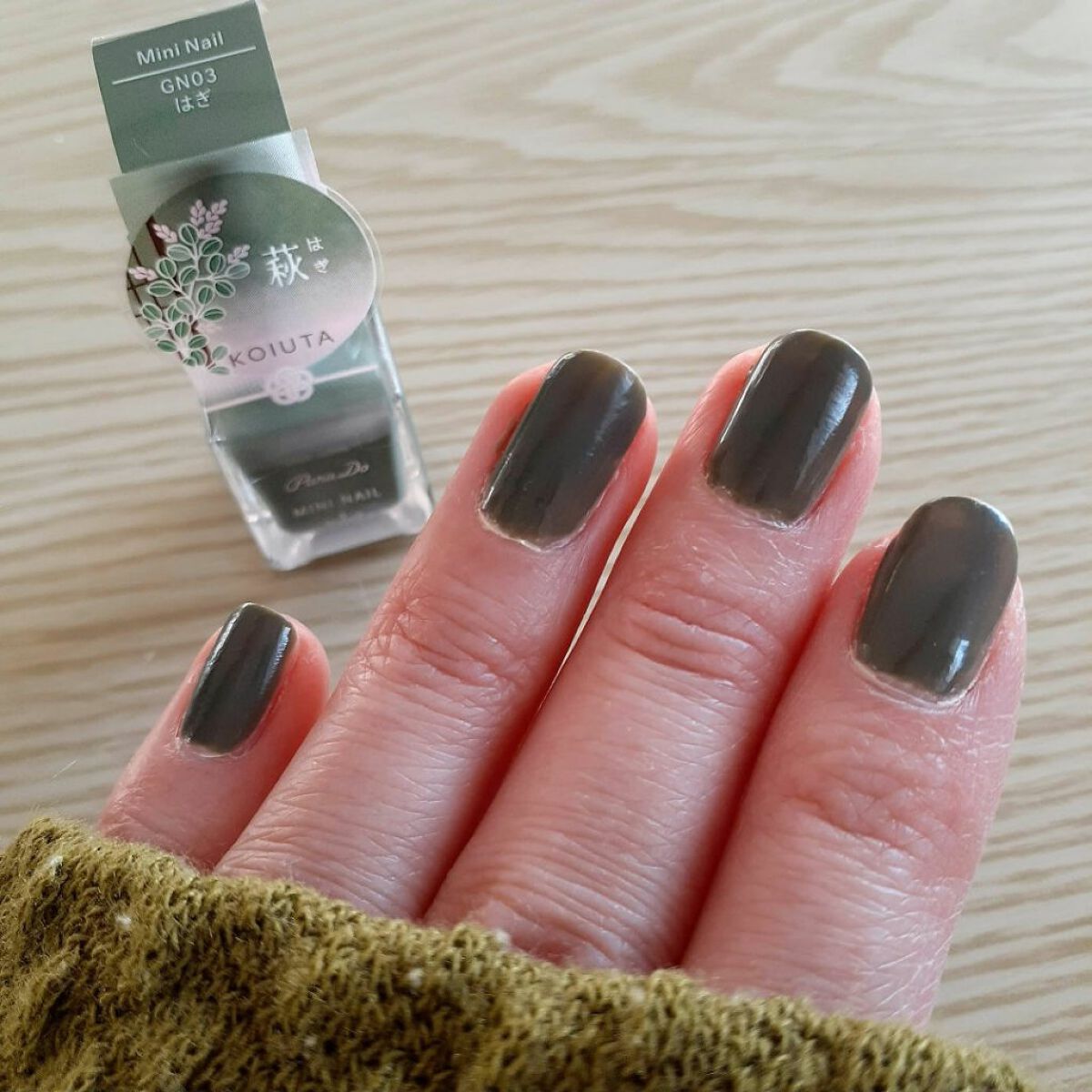 ミニネイル史上はじめての「和テイスト」のネイルカラーになっていますよ。 せつないけれど、心癒されるスモーキーグリーンのネイルです。 指先にしっくりと馴染む深みのあるカラー。 パラドゥのミニネイルは、サイズ小さいからいつも使い切れて良いですね。