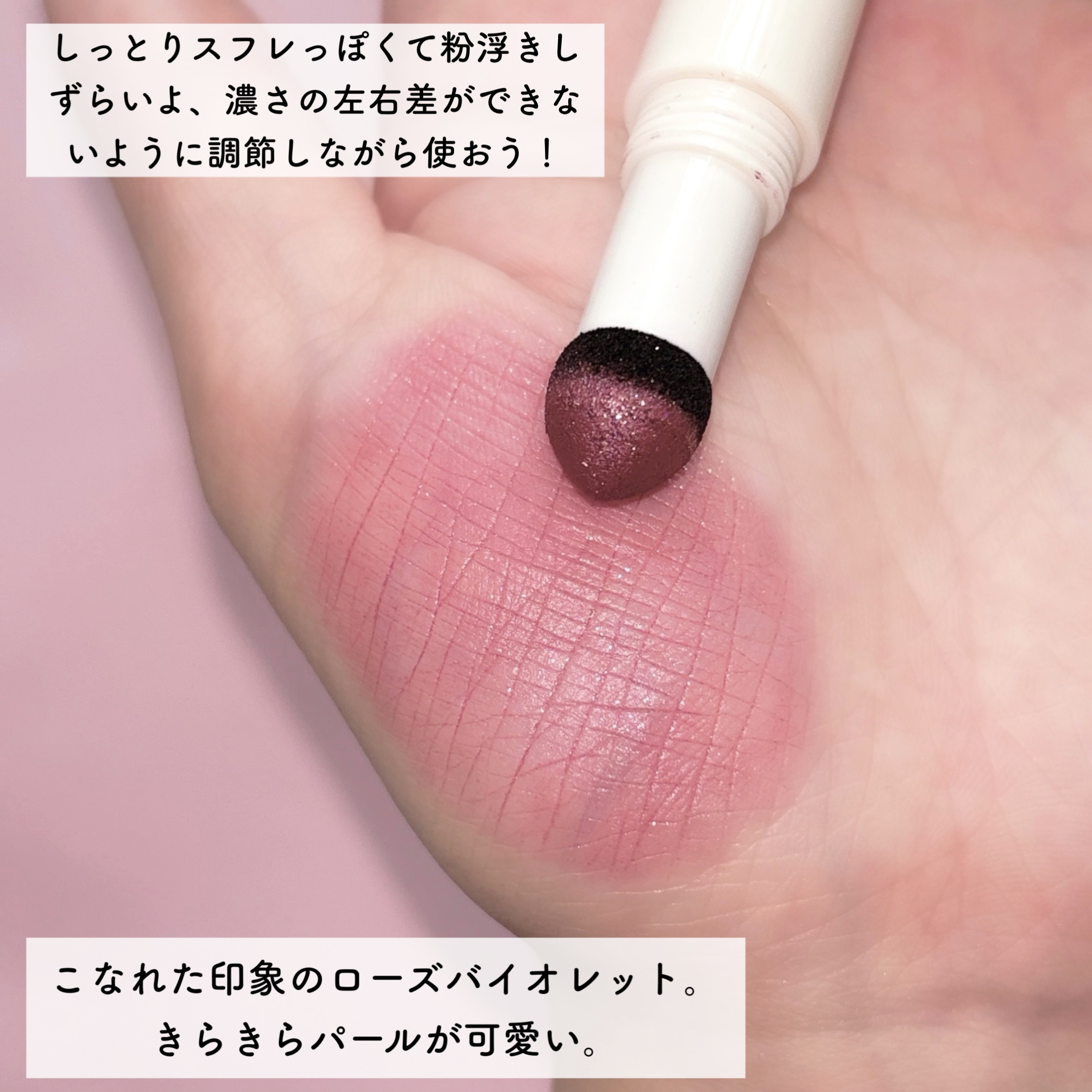 3種のミックスパール配合で濡れたようなツヤを演出。 くすみがちな目もとを明るくみせる。光拡散パウダー配合 まぶたに密着し粉浮きしにくい。しっとりスフレ処方 塗りやすいチップ一体型容器。 美容液成分配合 : ヒアルロン酸・コラーゲン・ローヤルゼリーエキス・カミツレエキス(すべて保湿成分) 色は、ローズバイオレットとあるように紫よりはややピンクよりのお色。 薄づきなので、量を調節しながら塗ることができ、グラデーションも作りやすかった💡´- クリアで濁りがなく、ラメのお陰もあってか少量塗りでもパッと目元が明るくなりました👀✨ オイル配合のためか、しっとりな反面、いつもはヨレないジェルライナーがヨレた気が💦 目元がヨレやすい方は別のパウダーアイシャドウかお粉が必要かもです。