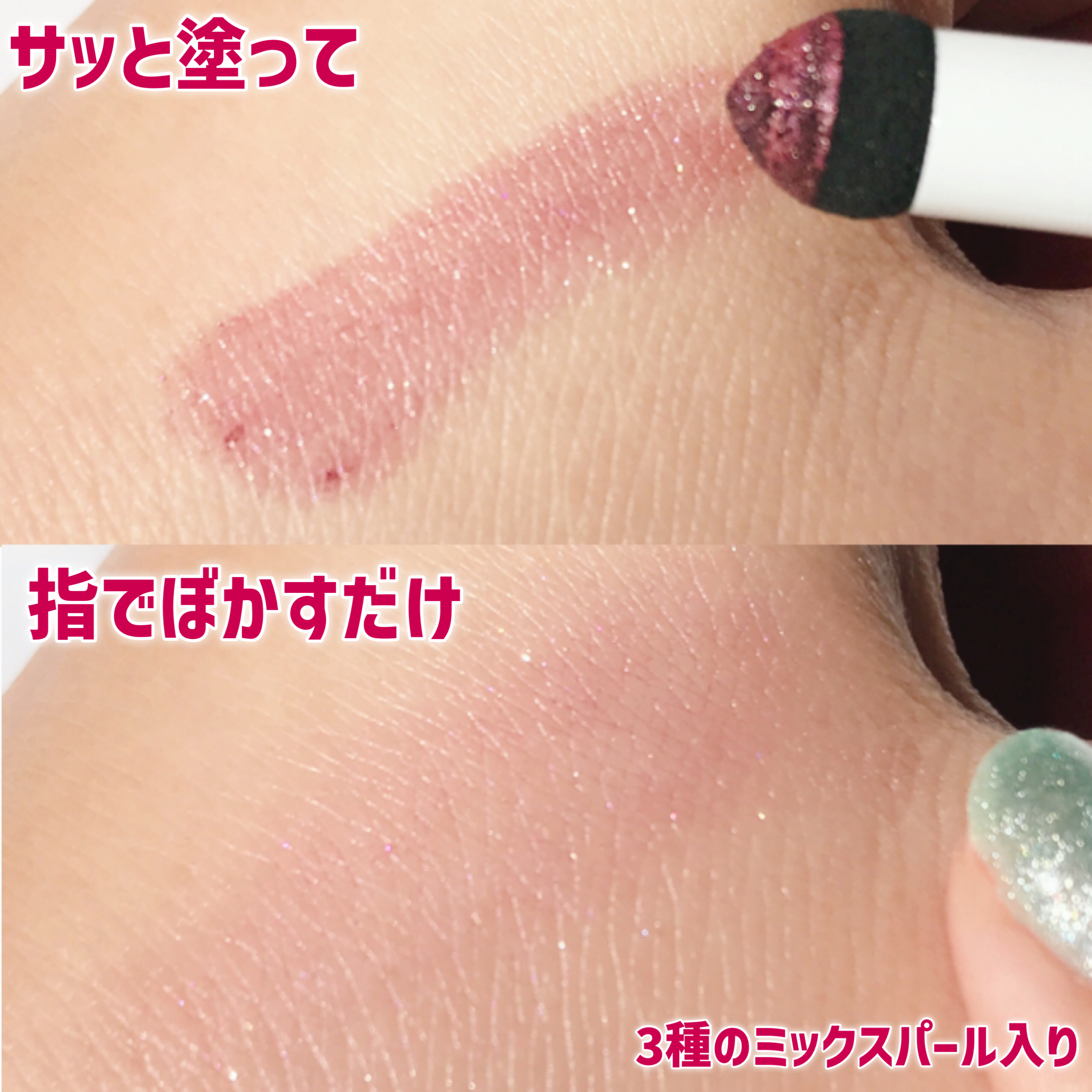 キャップの中にパウダーが入ってます。 チップでまぶたにのばさして、指でぼかすと しっかり密着するとのこと✨ 美容液成分配合で、しっとりとうるおう仕上がり❤️ 全3色あり、やっぱり私はこのカラーが気に入りました! キラキラもかなりキレイです♫ スルッと乗せれて発色も良き!! ただ、残量が分かりにくいけど 時短メイクには活躍できそうだし 他のカラーも、涙袋にも良さそうです✨