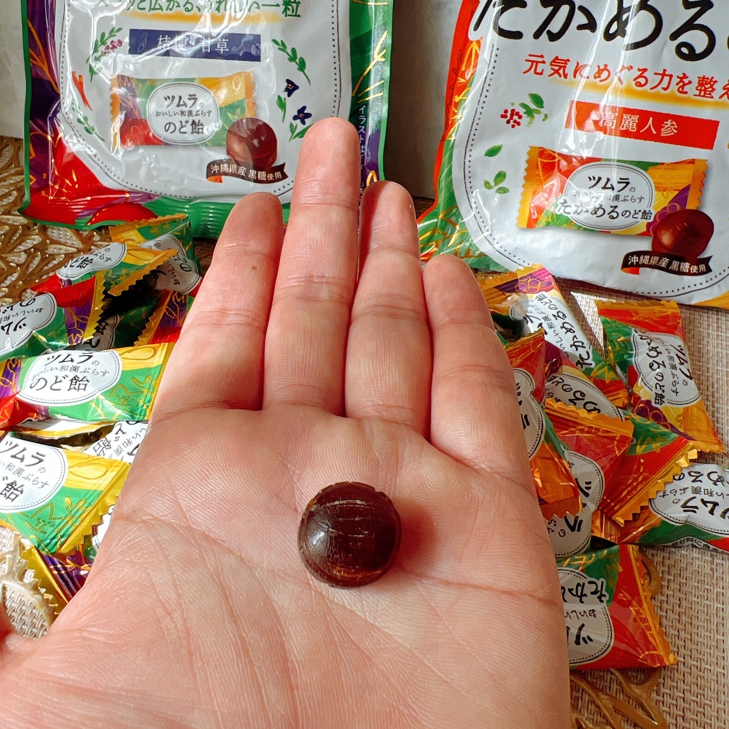 ツムラ「ツムラのおいし和漢ぷらす たかめるのど飴」は、漢方でおなじみのツムラと、お菓子の老舗メーカーである春日井製菓が共同開発した製品。 沖縄県産黒糖の優しい甘さに、和漢素材「高麗人参」をプラス。 めぐる力をのど飴で高められるなんて、嬉しいですよね。 ハーブ系のすっきりとしたのど飴で、美味しいですよ~。