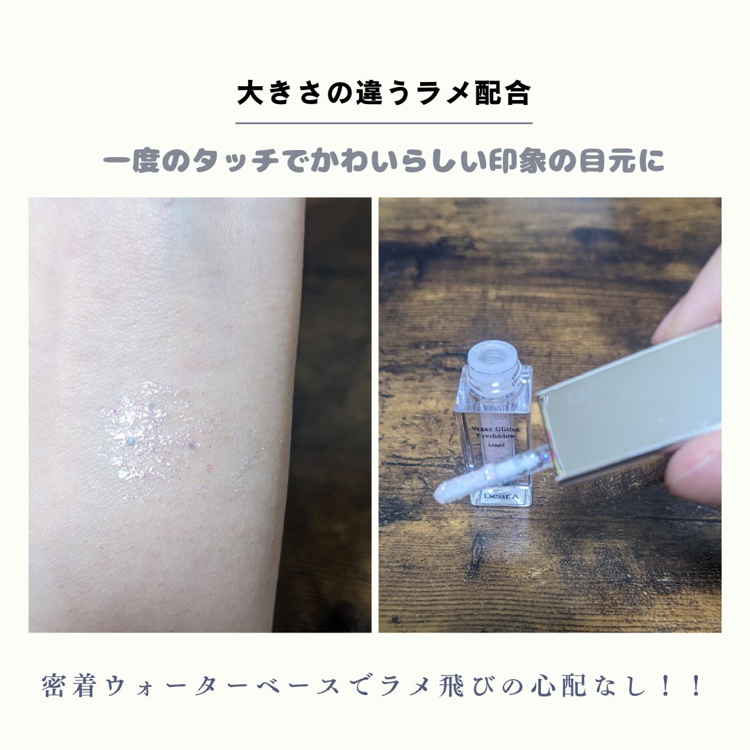 シャドウや涙袋など透明感ありながらも 可愛さを演出しやすく、使いやすいです!!! 細かいラメと六角グリッターが混ざっていて めちゃくちゃキラキラになりやすい ウォーターベースだからこそ ラメが飛びにくく長時間長持ちしやすい