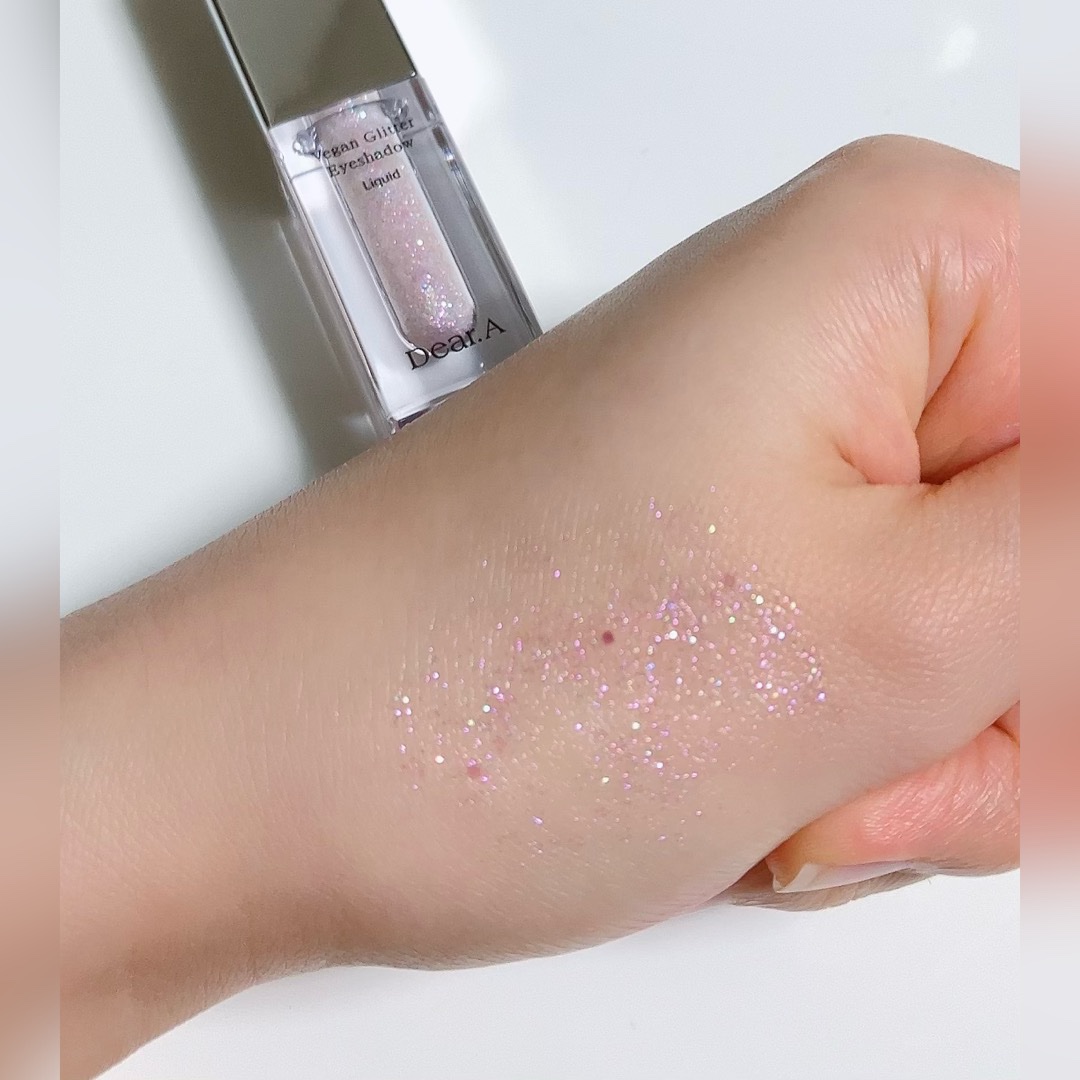 Dear.A グリッターアイシャドウ 01 MAUVEはピンクパープルに輝くグリッターです💕🫶🏻 多彩なカラーに輝く六角グリッターも時々入っていて小さいラメと大きいラメのバランスがとてもいいのに驚き😳 時間が経つとピタッと密着して落ちにくくなります! ただ、乾いたあとは少しラメ落ちしやすかったかな