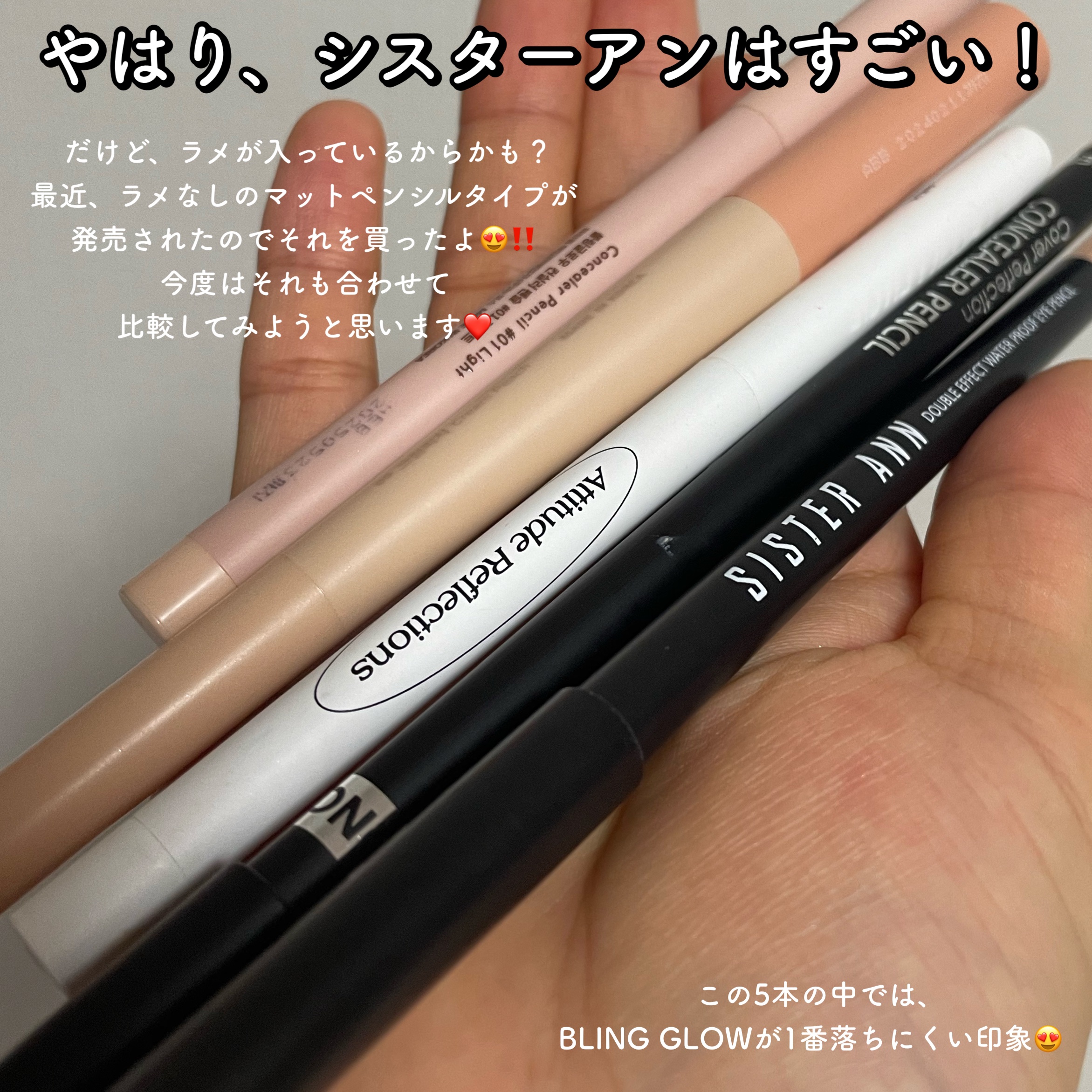 涙袋をナチュラルに盛ることができるペンシルにハマってます。 画像を見てわかるように、SISTER ANNがすごい。 強い! マットタイプならBLING GLOWが強め。 使っていてもそう感じます! SISTER ANNからは新作のマットタイプも発売されているので、メガ割で買いました😍‼️