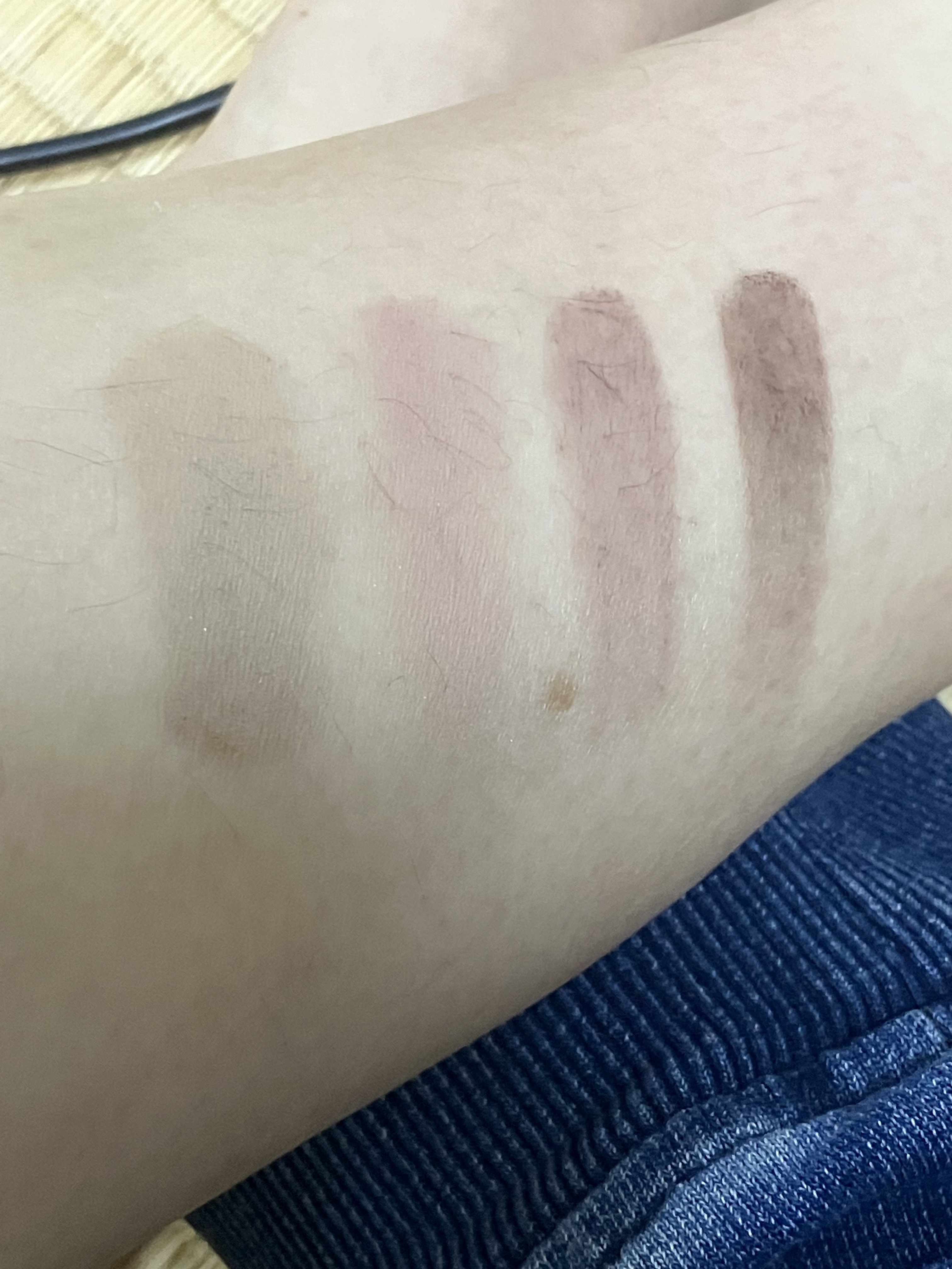まず最初に02のSoft Depthを購入しました。 とにかく可愛い、綺麗。 大人可愛い感じです。 実際につけてみても、凄く肌に馴染みました。 つけても青味や黄味は強くなく、くすみもそんなにないので、どんな人にも使いやすそうです。 発色も密着も良く、持ちも良いです。 全体的にふわっと可愛く仕上がるんですが、発色はしっかりしてくれるので、色味を出したいところにはきちんと出ます。 12色の中にシマーもマットもグリッターもあって、ベース、ポイント、締め色、アイライン、涙袋などの他、チークやシェーディング、ハイライトまでできるカラーが揃っているので、本当にこのパレット一つで完成しますし、これ一つでおでかけできちゃいます(日焼け止めとファンデは持っていってね) やさしい秋カラーなので、今から大活躍しそうな予感満載です。 そんなわけでワタクシ、早急にブラウンも買い足しました。