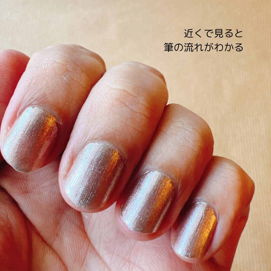 面倒くさがりなのでベースコートやトップコートは塗っておらず、これ1本で、1度塗りで仕上げた状態の写真です。 遠目に見ても結構キレイかなと思います。 ただ、「ああ、この方向に筆を動かしたのね」とわかるようなタイプなので、ササッと少しでも速く雑に塗りたいという場合はちょっと仕上がりに不満が出るかもなと思います。