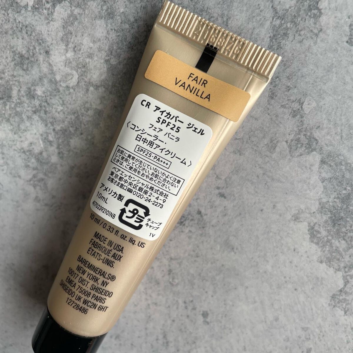 ベアミネラルのCRアイカバージェル✨目元用のコンシーラー兼アイクリーム。SPF25なので日中用です☀️【商品説明】日中の目もとを保護するアイクリーム効果と、すっきり明るい*1印象を持続するコンシーラー効果の2つを持ち合わせた、新発想のカバーするUVアイクリームです。*1メイクアップ効果による全5色のうち、今回私がお試しさせていただいたのはフェアバニラという明るいピンクオークル系のカラーです。私は目の下のクマがかなり気になるので、主にそこに使用。伸びがよく、極少量でオッケーなので出し過ぎ注意⚠️アイカバージェルという名ですが、テクスチャーは柔らかめのクリーム。指で塗り拡げるだけでもきれいに伸ばすことができました👌自然に目周りをカバーすることができ、これはなかなかの優秀アイテム👍極少量を使うだけなので、コスパも良くていいですね😄