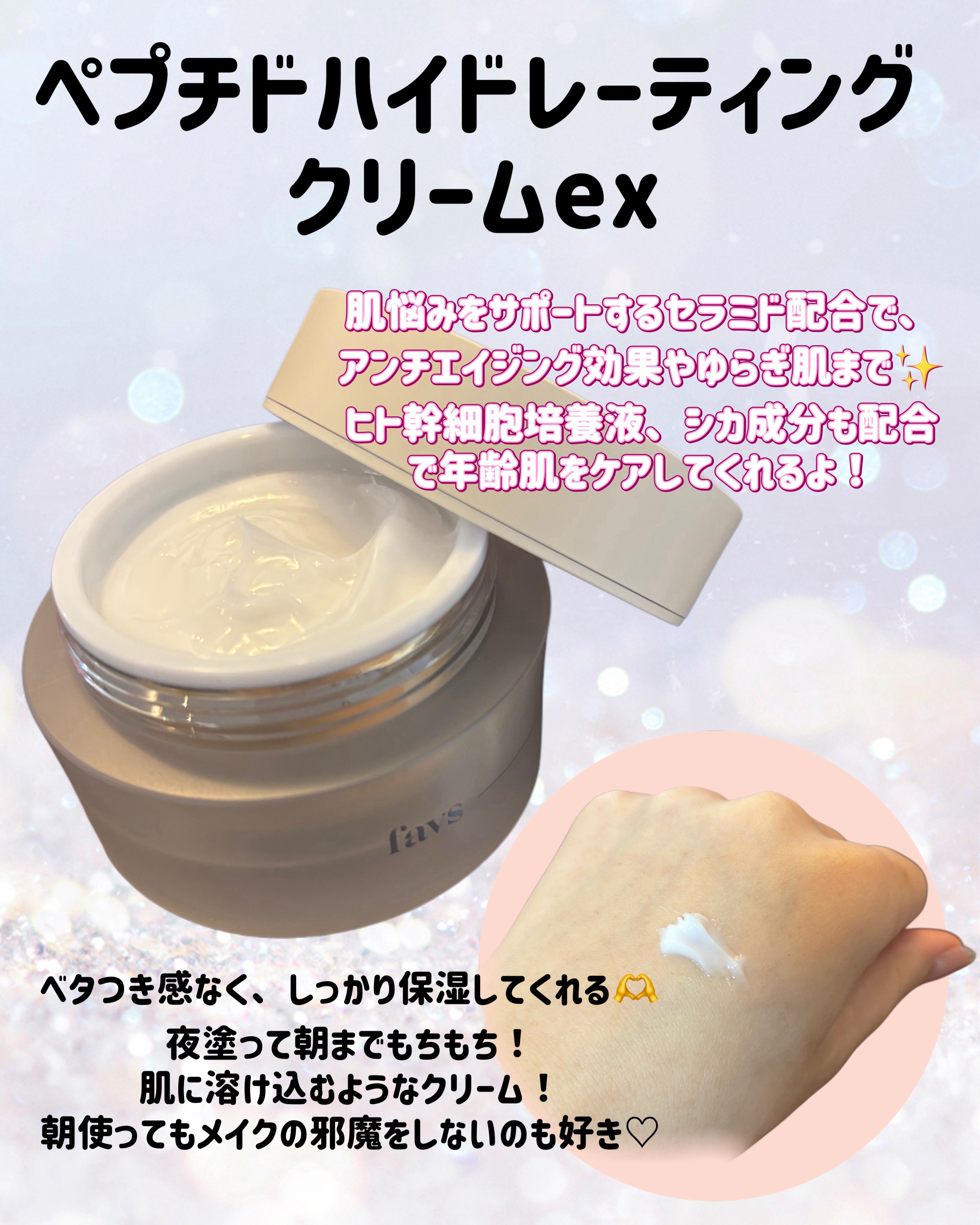 #PR山中美智子さんによる、美しく時を重ねる日々をサポートするスキンケアブランドfavs(ファブス)のアイテムをご紹介🌟 ❤︎ペプチドハイドレーティングクリームEX50g\ペプチド*の力でうるおいをサポート/(*保湿成分)ヒト幹細胞順化培養液...