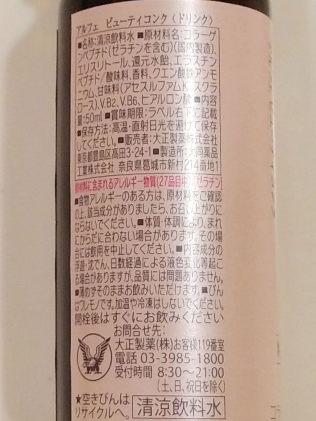 ALFE ビューティーコンク下書きのまま放置して、もう昨年末のことですが、サンプルをいただきました。LIPSの商品登録二重にされててどっちが良いかわかんなかったから両方紐付けておきますね…。匂いは果汁グミみたいな感じで、とってもフルーティーです。ひとくち飲んでみたら、まぁ匂いの味なので、果汁グミ飲んでる気になりました。後味は酸っぱくて、クエン酸を感じます。とっても美味しいわけではないけれど、決して不味いことはないなと思いました。少なくとも、毎日飲むことにしても苦痛ではなさそうです。資生堂のザ・コラーゲンと比べると、味としてはアルフェの方が好みだけれど、後味の酸味がないぶんザ・コラーゲンの方が飲みやすいような気がします。酸味があまり得意でない人には向いてないかなと思いました。酸っぱい方がビタミン摂ってる感が出るのはわかるけど。ビタミンと一緒に鉄分を補給できるのも、慢性貧血の私には嬉しいポイントです。とはいえ鉄の補給を助けるのはビタミンCで、これに入っているのはビタミンBなんですけれども。グミ飲んでるみたいって感想通り、コラーゲン(というかゼラチン?)はたくさん入っているんだろうなと思います。よほどのことがないと美容ドリンクわざわざ買わないので、現品購入はあるかもしれないしないかもしれないんですけど、少なくとも美容ドリンクを買いに行くことがあれば候補には挙がると思います。いただいた10本はプチ贅沢として、時々ドーピングに使ってます。#インナーケア#美容ドリンク#コラーゲン