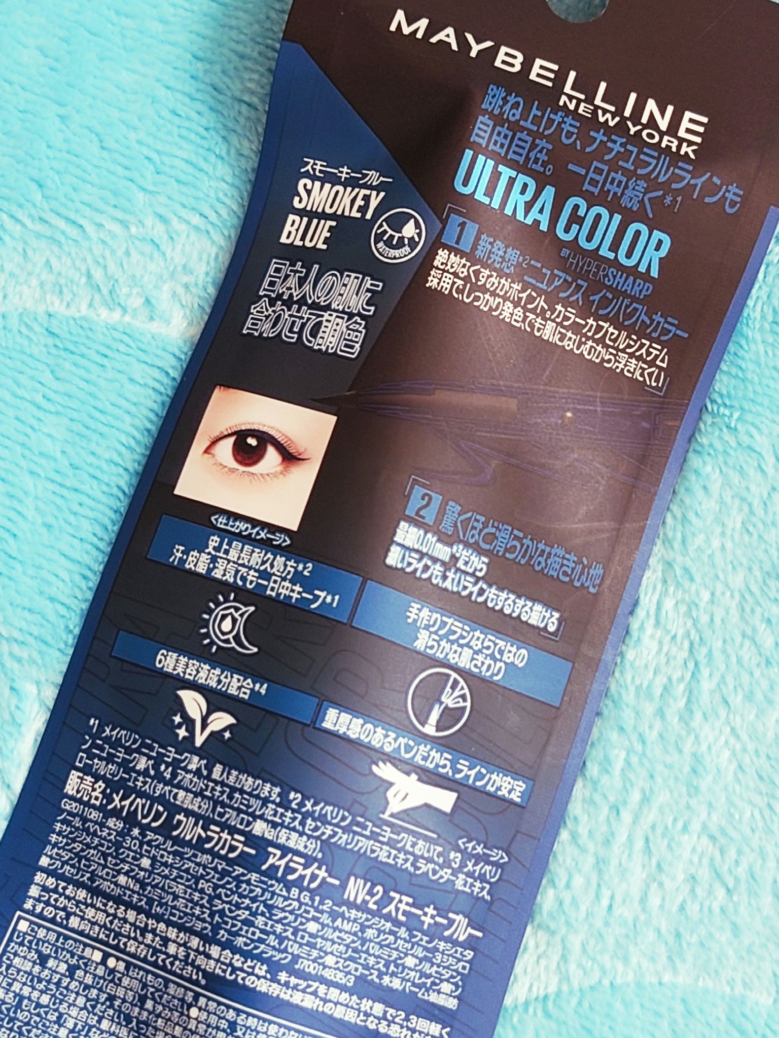 MAYBELLINENEWYORK ウルトラカラーアイライナー【使った商品】NV-2 ポップなスモーキーブルー【商品の特徴】振ってカチカチさせてから使うリキッドタイプコシのある筆状【使用感】目元に一発描きでも色ムラが出てしまう皮脂や汗・湿気への耐久性もあまり感じられなかった納得いくまで何度もやり直し、いざ出掛け、出先の化粧室で鏡を見るともう取れてる…がよくある外出してから2時間も経たない間にキープミストをしても相性が悪いのか使用した段階で滲んで取れた事もある【良いところ】強いて言えば発色がハッキリした時は綺麗な青【イマイチなところ】色ムラ 耐久性を感じられなかった【どんな人におすすめ?】短時間の使用・一発で色ムラ気にせず描ける方には合うと思いますがそれでもあまりおすすめしない【使い方】アイメイクする前にルースパウダーで目元の油分を取ったり、目尻には引かず睫毛の間に点置きしての使用もしたが、どれも取れやすく短時間でも持たなかったネイビー過ぎず水色ほど淡く無い青に惹かれて購入したが私には合わなかった。