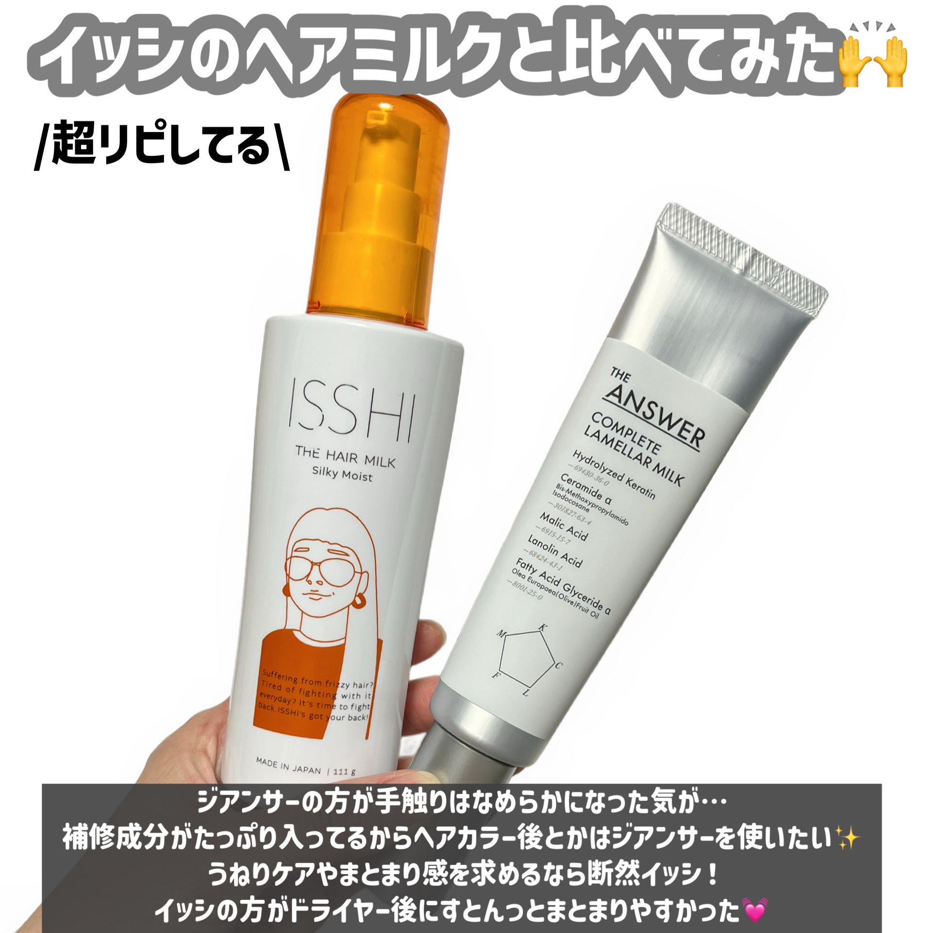THEANSWERコンプリートラメラミルク1,540円(税込)────────────大人気ヘアケアブランドTHEANSWERから出てるヘアミルク。どうやら髪に良い成分がもりもりとのことで買ってみたよ🤔花王開発成分を含む、最多14種の成分を最高濃度で配合しているそう✨補修に特化しているヘアミルクっぽいので、ヘアカラー後や傷みが気になるとき特に使いたい🙌髪の内側から塗るのを推奨とのこと。そうすることで髪の毛全体にムラなく行き渡るんだって✨ドライ後はしっとりまとまるというより、さらっと軽くなめらかな手触りに。超リピートしてるイッシのヘアミルクと比べてみると、イッシの方がすとんとまとまり感があるからうねりやすい方にはイッシがおすすめ。髪の毛の傷みが気になる方には、補修成分がたっぷりのTHEANSWERがおすすめ🫶使い続けることで傷みをケアできると良いな😭🙏#ヘアミルク#プチプラ#ダメージケア#コンプリートラメラミルク
