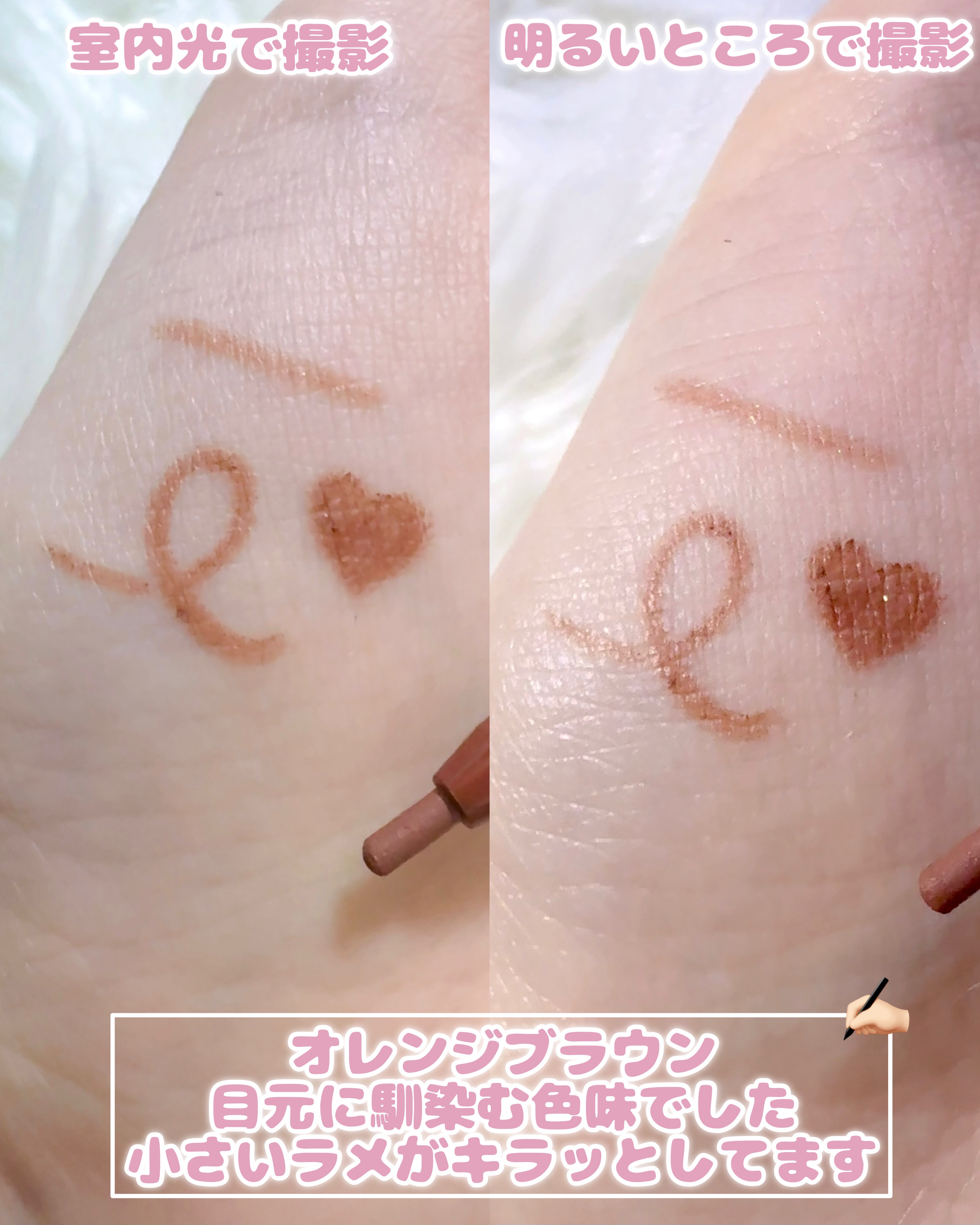 この新色が1番好き🥹💗 微細なラメ入りの暖かいブラウンで 結構オレンジ寄りな感じ!🧡🤎 オレンジメイクとかブラウンメイクを よくする方絶対使いやすいです🙋♀️ しかも前まで芯が硬めで そんなにスルスルって描ける イメージなかったけど 今回のは柔らかくてスルスル描けた✨ ウォータープルーフで落ちにくいから これは買いなコスメだと思います🥺