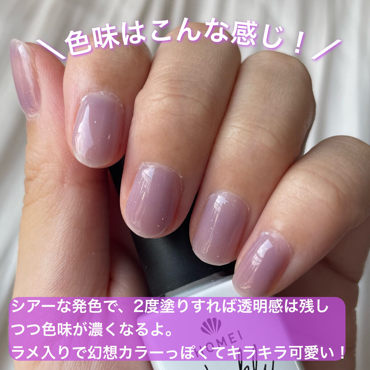 塗るだけ簡単♡ウィークリージェルネイルHOMEIウィークリージェルNE-150スモーキーパープルSmokyPurple【商品の特徴】サンディングやベースジェルが要らない、そのまま塗るだけのジェルです。オフもリムーバーなどなしでやさしく剥がすだけ!✨️【使用感】簡単で塗りやすく、道具もこれとライトだけあればできるので気軽に楽しめるのが良いです。初めてジェルネイルに挑戦する方にはすごくおすすめ♡【色味】透ける絶妙なパープルでめちゃくちゃ可愛い😭🎀控えめでちらちらっと輝くラメもかわいすぎます🤦♀️発色は薄めなので重ねて使うのがお気に入りです。【良いところ】カラーも色々あるところや、オフも簡単なところなどが気に入っています!【イマイチなところ】サンディング・ベースなしでこれを塗って一週間持つかと言われると、うーん🤔私は全然持たなかったです💦手先をよくお仕事・家事などで使う方はすぐに取れてしまうと思います。【どんな人におすすめ?】ジェルネイルに気軽に挑戦してみたい方、すぐ違うネイルにしたくなっちゃう方など!私は結局サンディング・ベースジェルをした上でこれを塗って、その上からトップジェルも塗っています笑長持ちさせたい方はHOMEIのロングキープベースジェル、スペシャルトップジェルもおすすめです!!それまでは100均のベースジェル・トップジェルを使っていたのですが、うまく硬化できなかったり、すごく塗りにくかったりで、、、試しにHOMEIのを買ってみたら全然違って感動しました😭✨すごく塗りやすいテクスチャだし、なによりトップのツヤ感が全然違いました✨️よくセルフジェルをする方には是非ベースやトップこそ良いやつを試してみてほしいです!#HOMEI#ウィークリージェル#スモーキーパープル#パープルネイル#ラベンダー#ジェルネイル#セルフジェル#セルフジェルネイル#ロングキープベースジェル#スペシャルトップジェル#ベースジェル#トップジェル